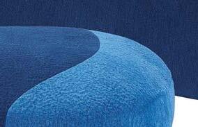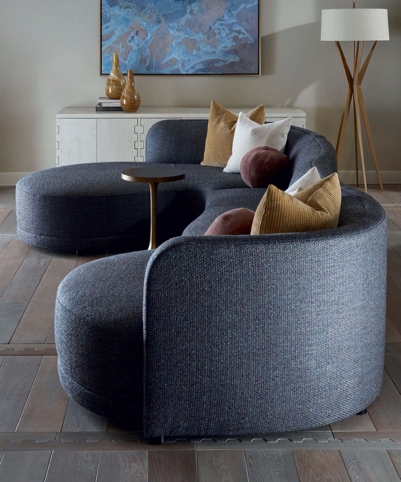 Bubble 2. Curved 3-4 seat sofa and armchairs, designed by Sacha Lakic. Ovni Up. Cocktail tables, designed by Vincenzo Maiolino. Yumi. Rug, designed by Messieurs.