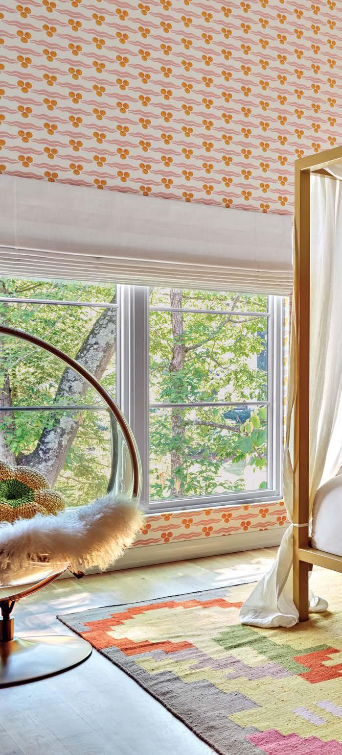 Other spaces received heftier doses of pure color. For the primary bedroom, “ The clients wanted a cocoon,” Davis reveals. Nestled into a corner with a tree house-like view, the space leans into its natural environment through deep-green walls and gauzy draperies that envelop the room. An arched headboard and checkered rug recall architectural motifs from the main floor. Meanwhile, the daughter’s bedroom embraces an even brighter palette in coral and salmon—with similar hues repeated in the wife’s office.