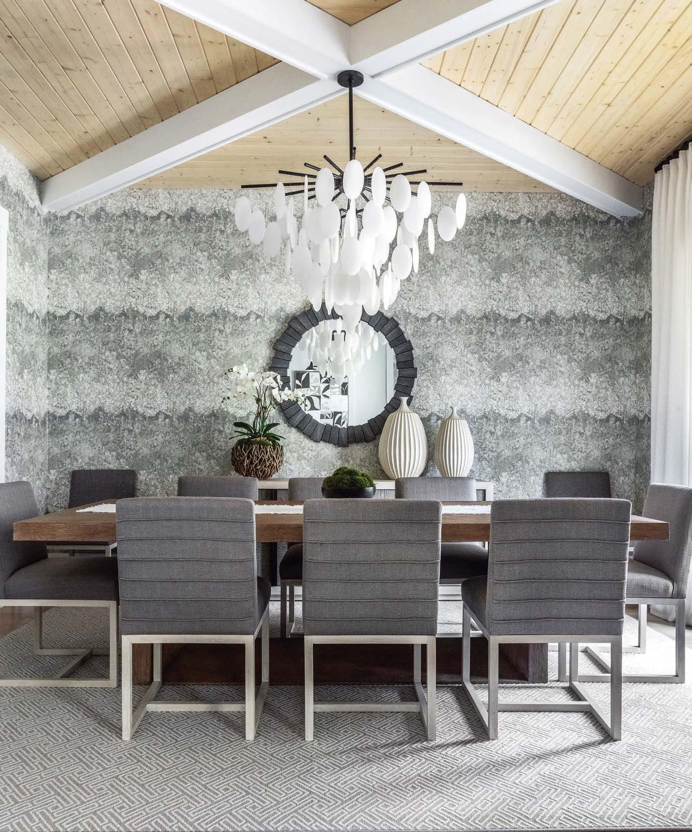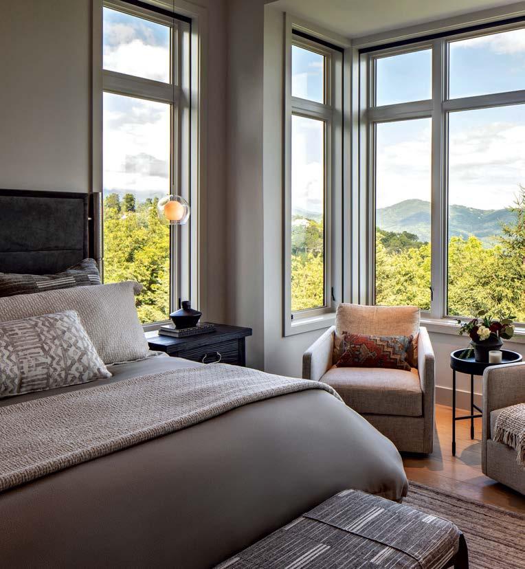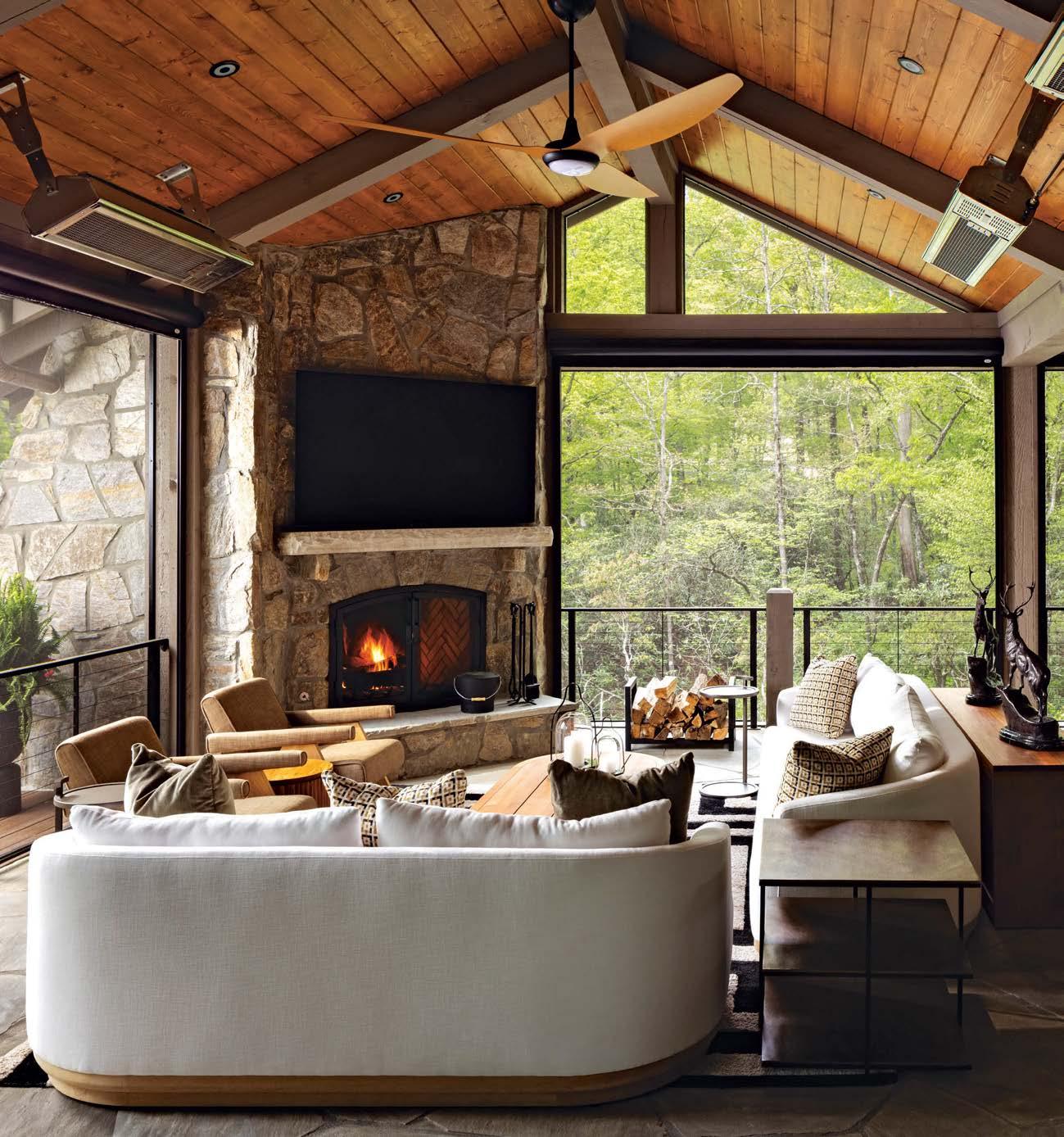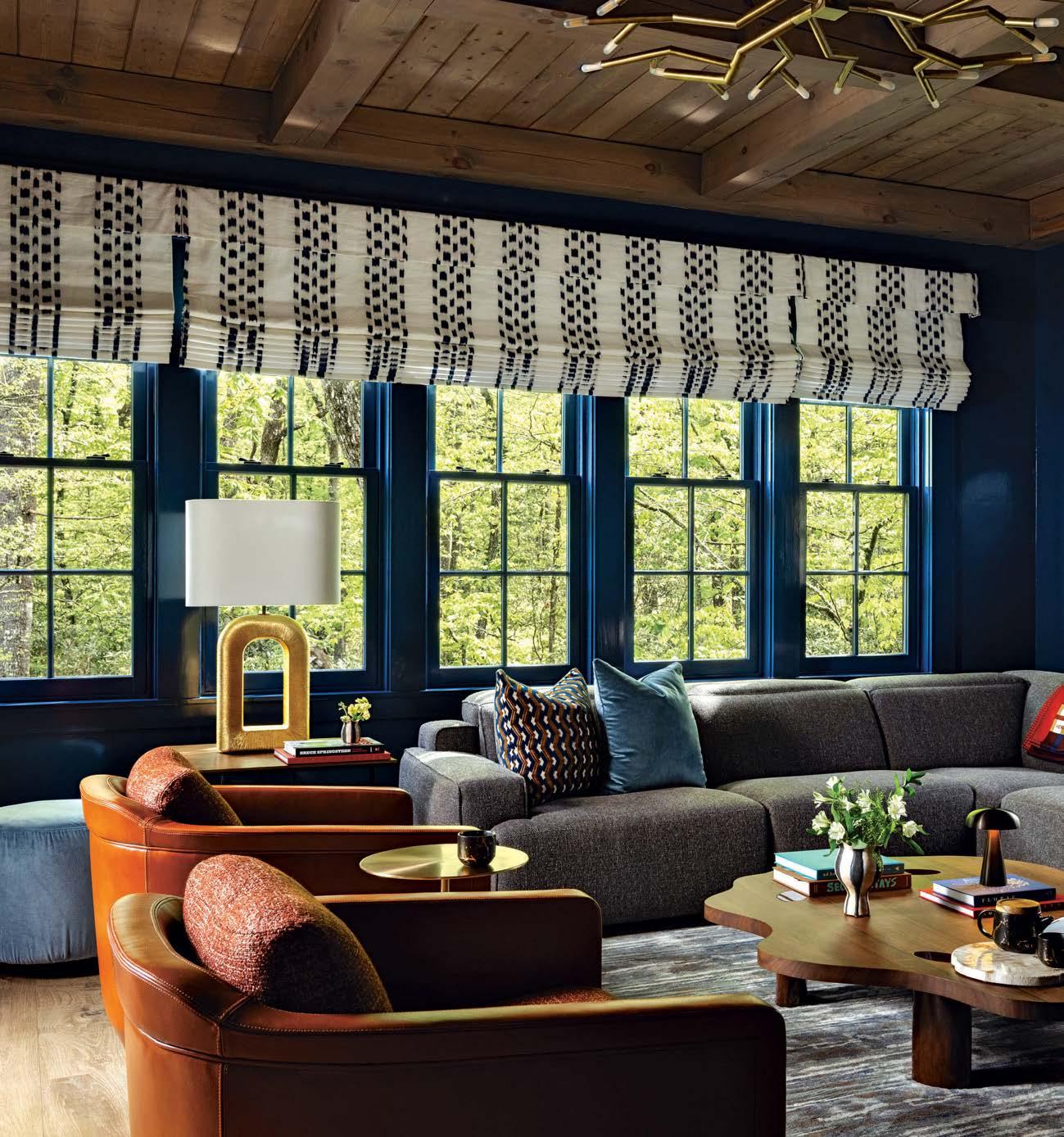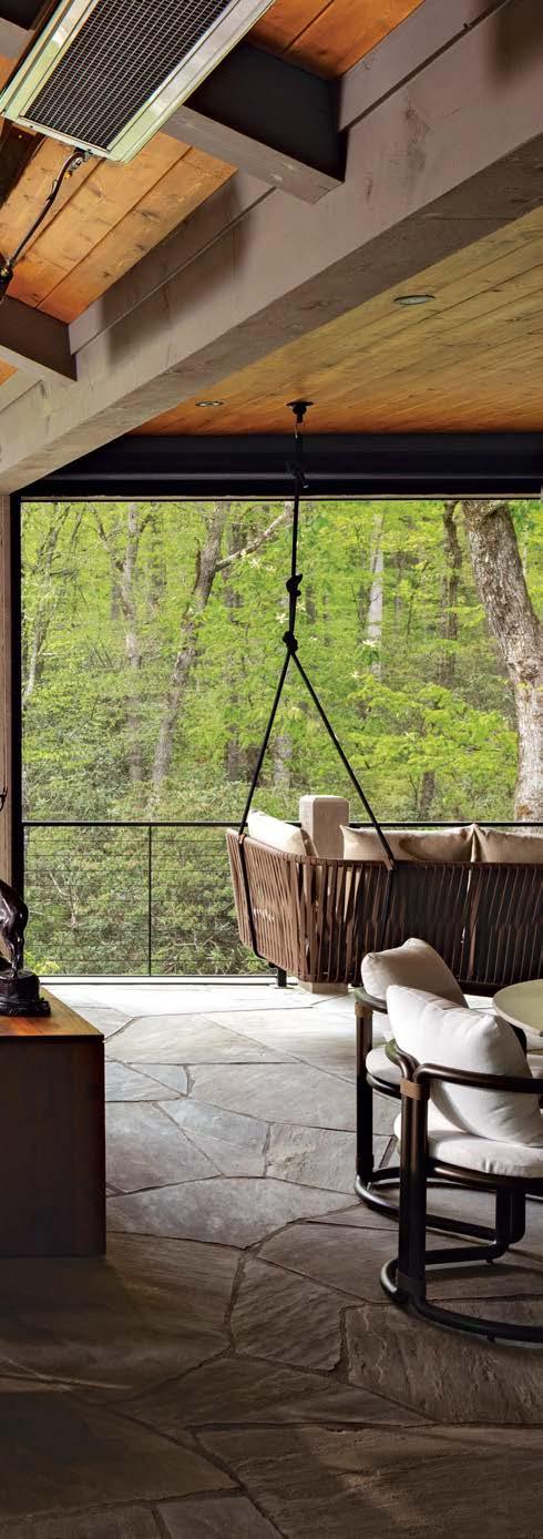 “One of our recently completed new-build projects reflects our aesthetic and design philosophy,” Roberts-Early shares. “We are located in Western North Carolina, where the surrounding landscape is just as integral as the home itself. This project highlights our ability to connect interior spaces with the natural environment. From the beginning, we worked in close collaboration with the builder and architectural firm to ensure a cohesive vision that flowed from concept to completion. Our design layers rich materials and textures by balancing raw stone, smooth wood, soft textiles and sleek metal to create a space that is both tactile and visually compelling. Thoughtfully curated contemporary artwork and distinctive accents further demonstrate our eye for styling and our ability to bring character and warmth to a clean, modern design.”