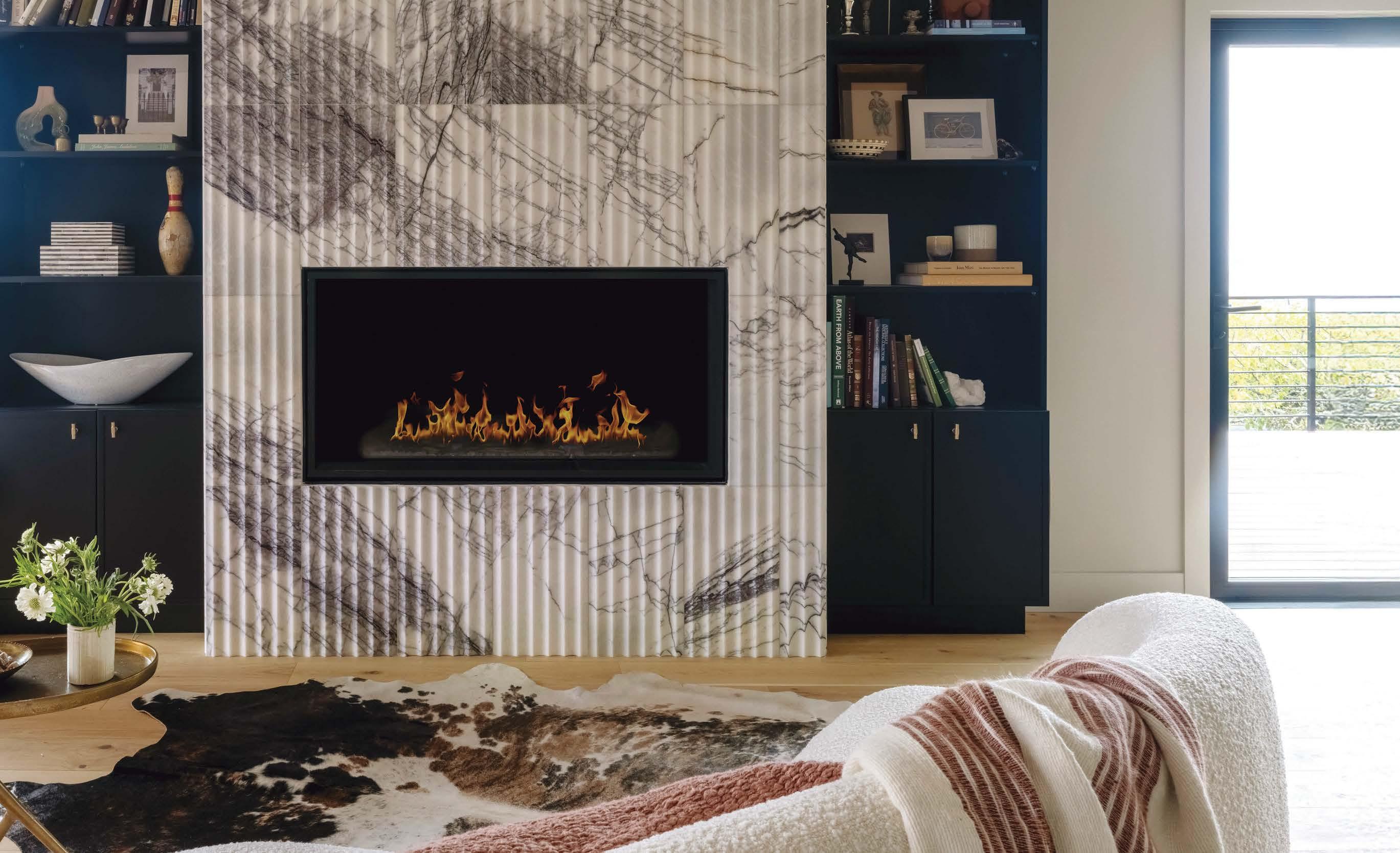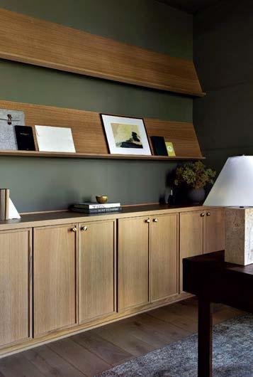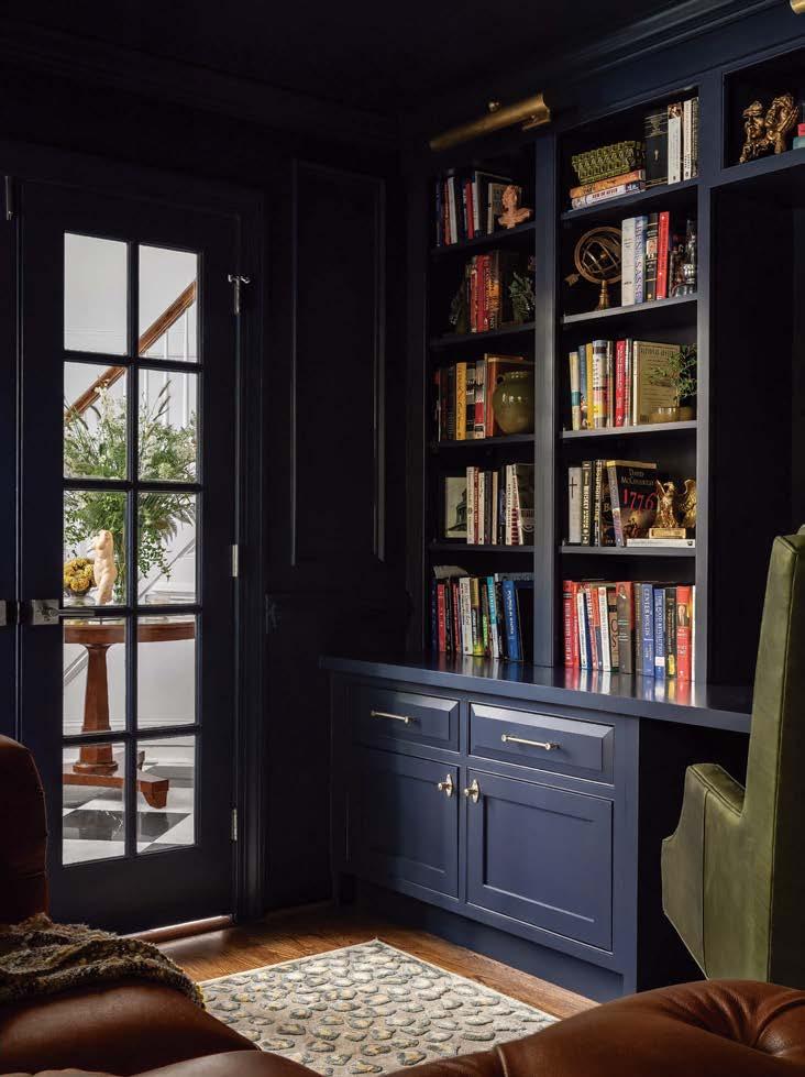 ABOVE Perfectly asymmetrical, the stone plinth along the fireplace wall grounds this space and provides visual interest. TOP This primary bathroom drenched in natural light features a vanity wall clad in reeded marble, complemented by warm wood-toned cabinetry and brass accents. CENTER Awash in pacific blue limewash and complemented by a symphony of patterns, colors and textures, this owner’s suite is the ideal moody retreat. BOTTOM A home office with a bespoke twist to the millwork, this space allows the user to display books and personal heirlooms in a casual but elevated manner. PHOTOGRAPHY Above, Top + Bottom by CAROLINE SHARPNACK; Center + Portrait by JESSICA AMERSON