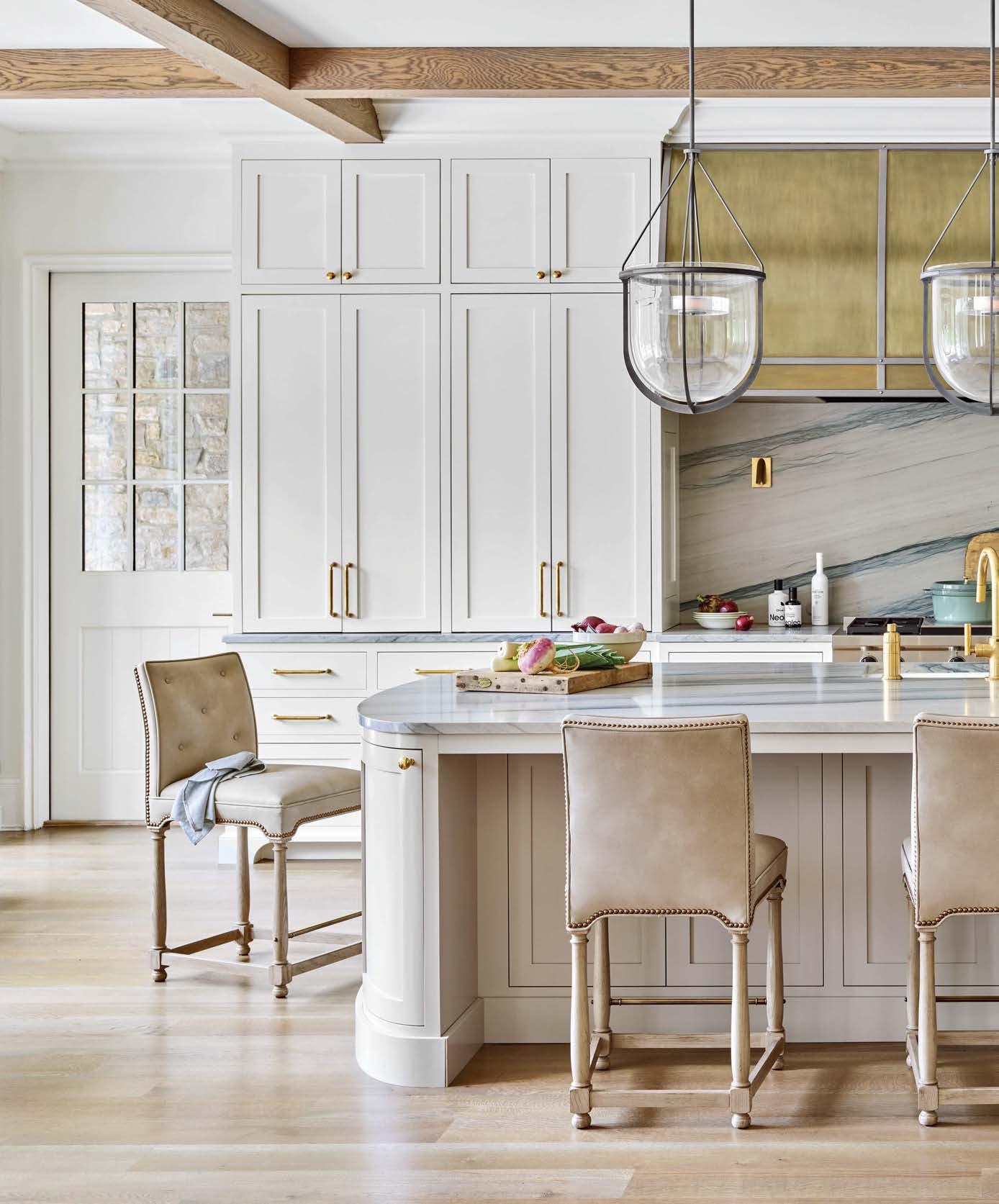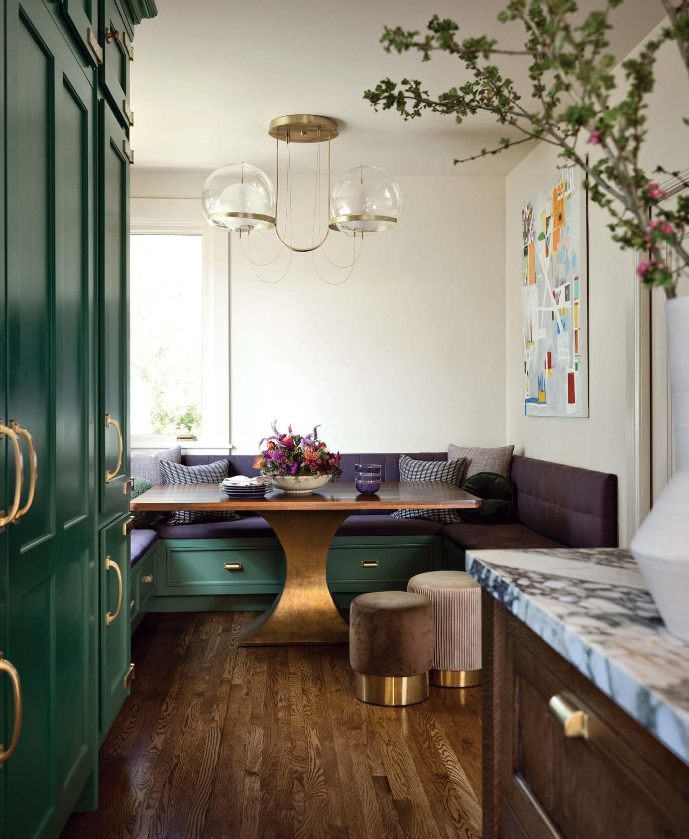 Above: Visual Comfort & Co. sconces punctuate the kitchen’s arched ceiling, mimicking the curves of the dining benches below. Lulu and Georgia chairs line the Doorman table.