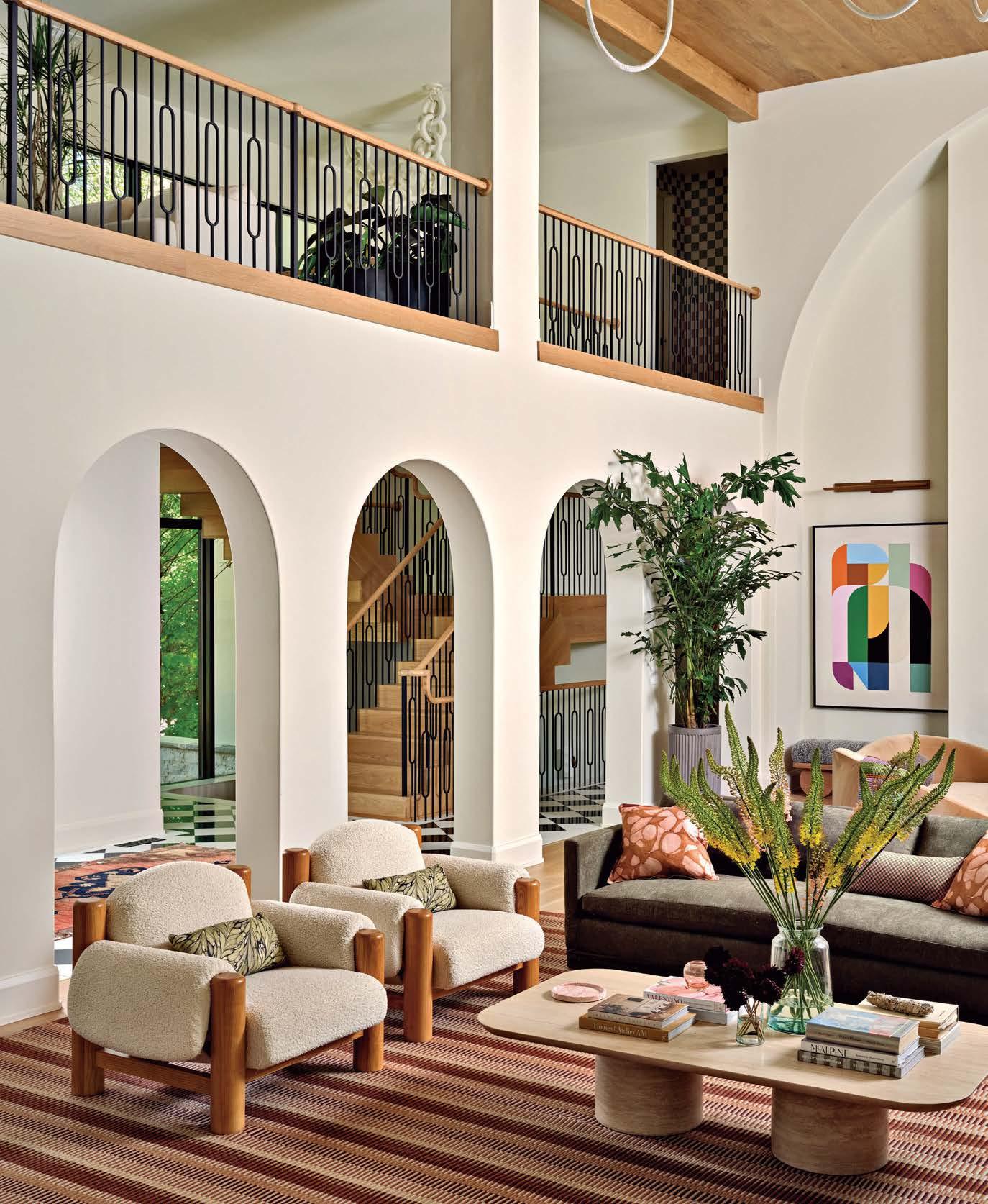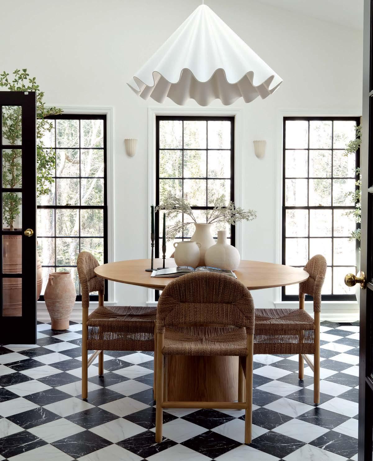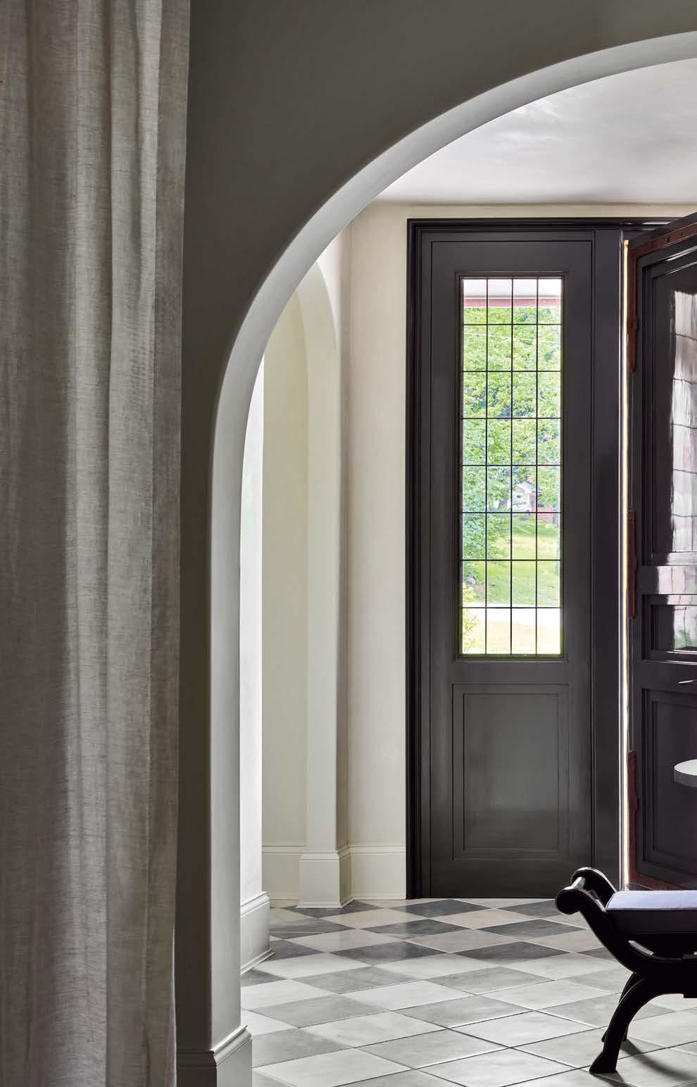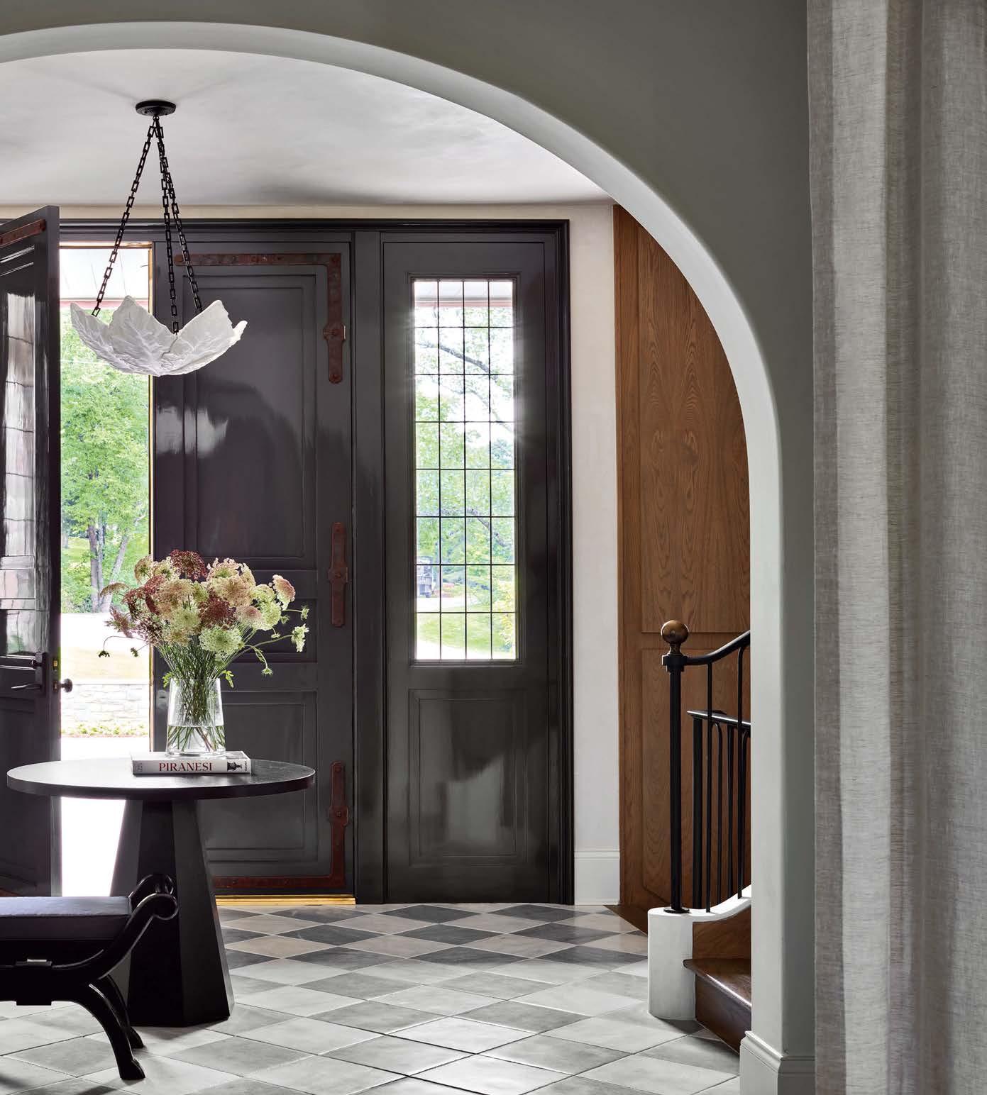 The arched details first appear at the front façade, where a sleek metal-frame door opens to a hallway tiled in a black-and-white checkerboard flooring pattern. “We wanted to delineate the entry from the rest of the house,” Davis says, “but it still feels so classic.”