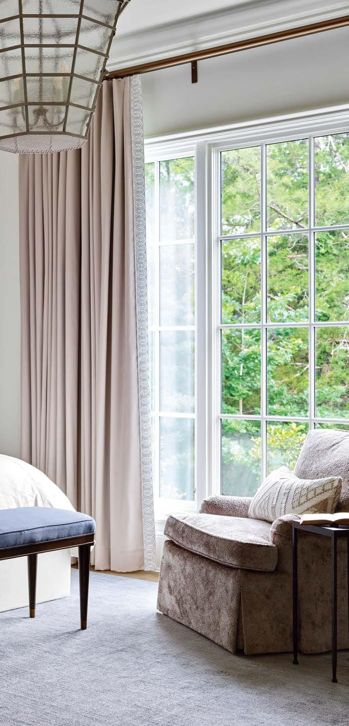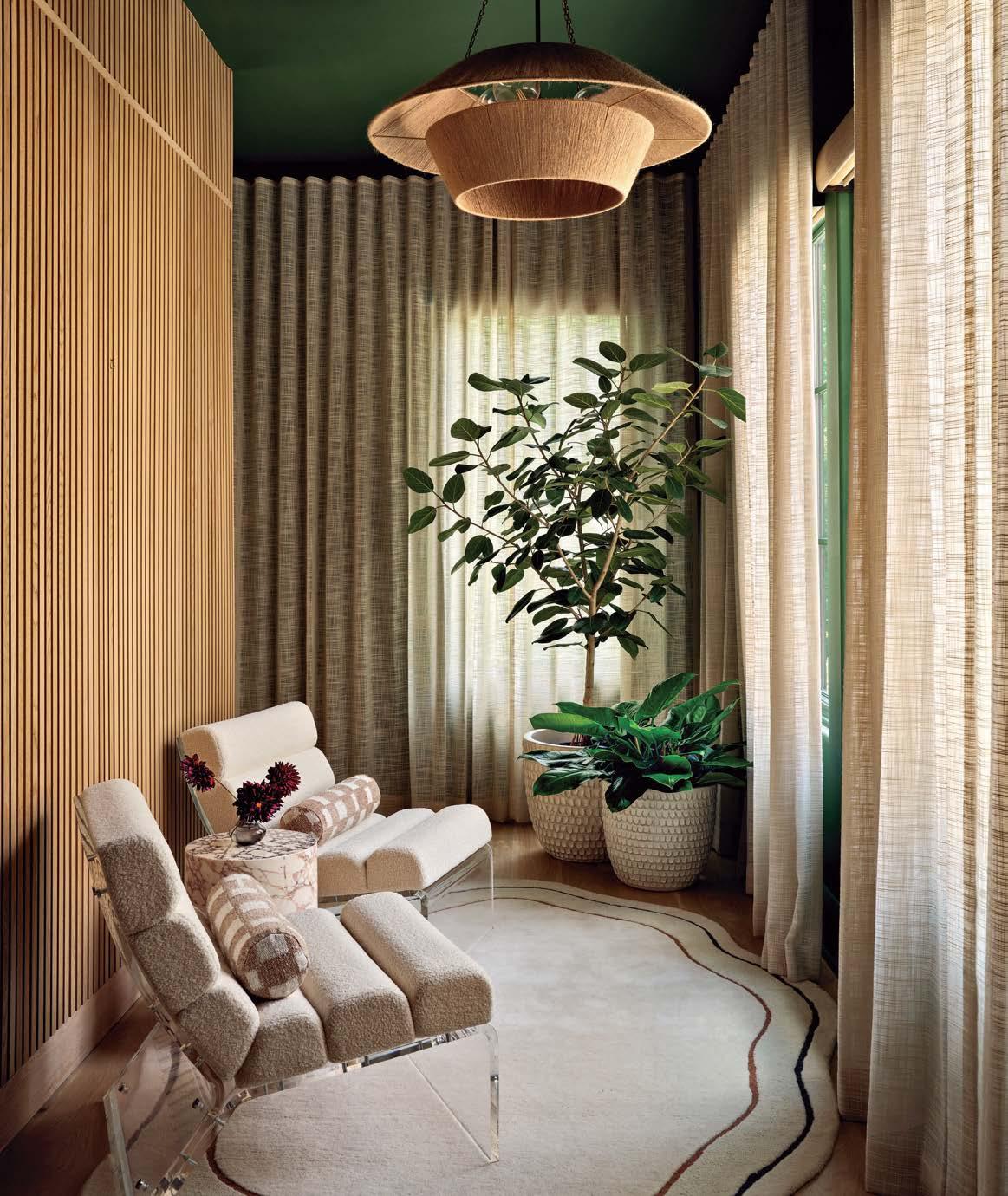 Above: A rug from Design Within Reach, a Nickey Kehoe light fixture and 1970s-inspired chairs from CB2 form a stylishly cozy seating nook in the primary bedroom. Draperies made from a Kravet fabric envelop the space in soft elegance.