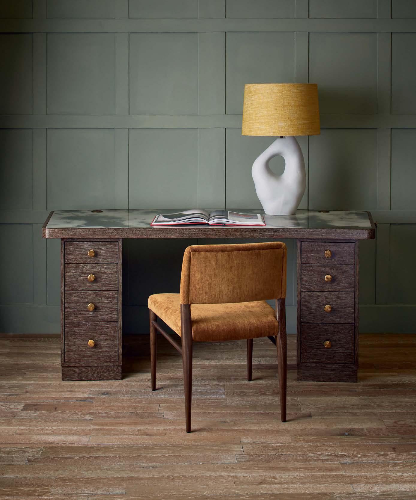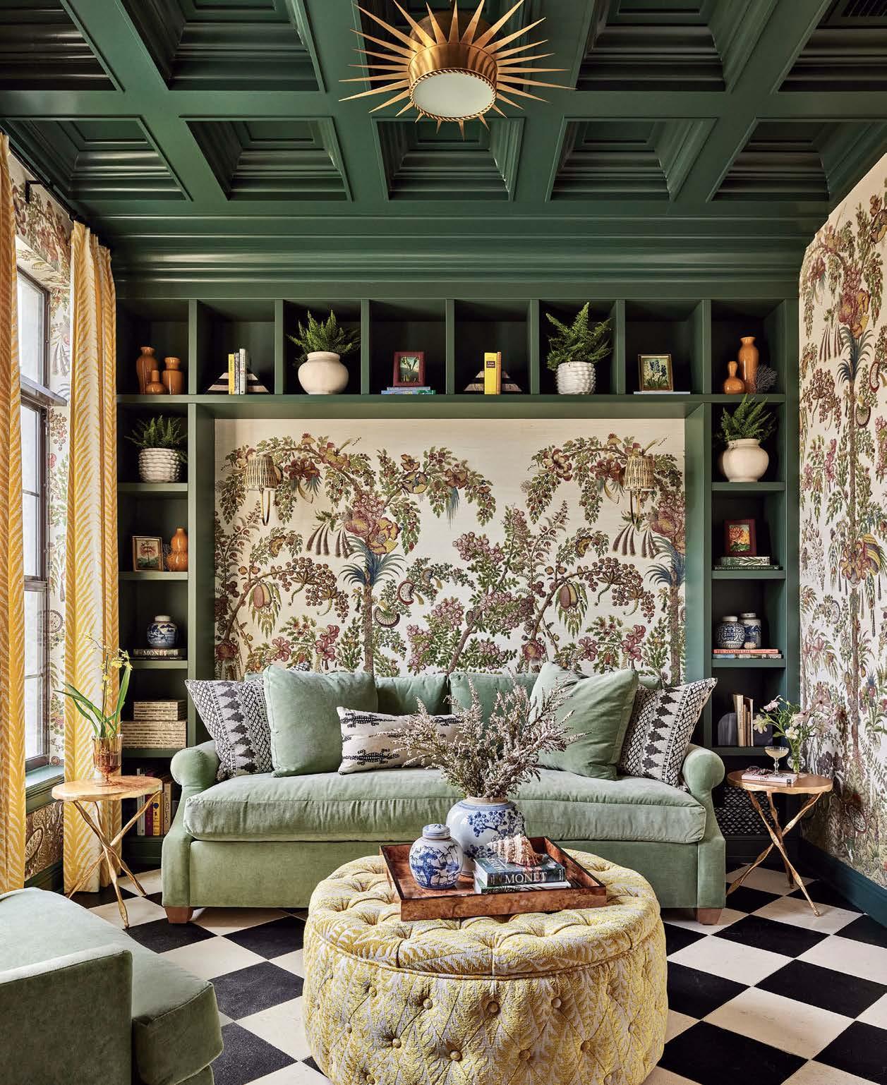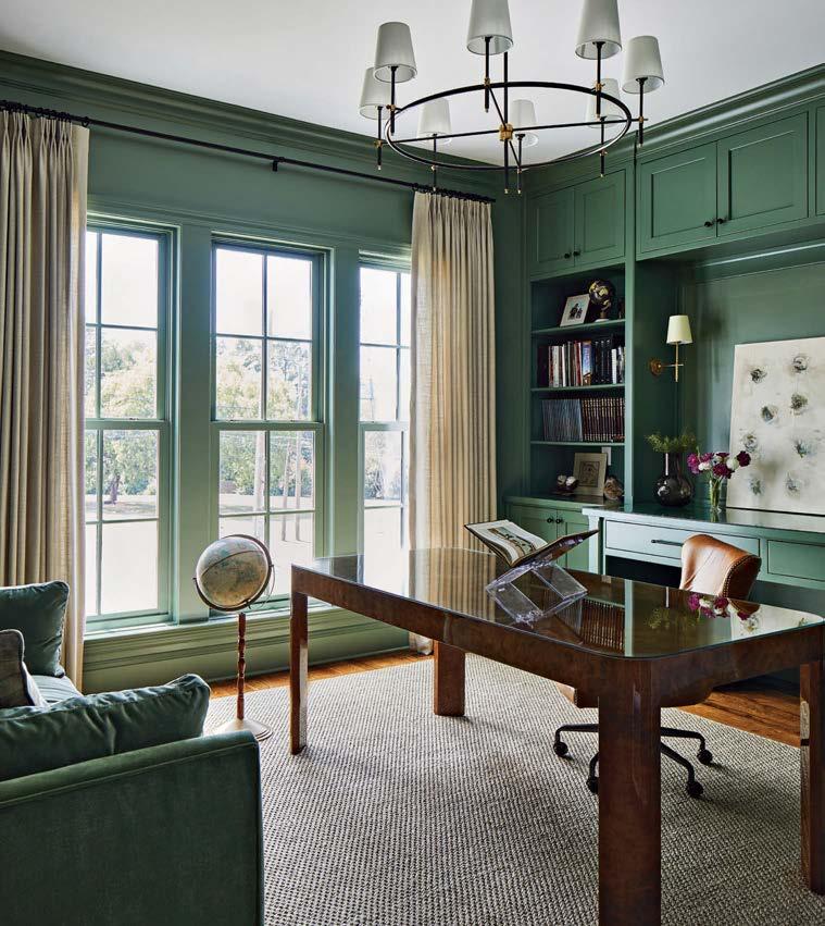LEFT For this home office, Tyler Spano color-drenched the space in Benjamin Moore’s Avon Green, softening the bold palette with complementary textures to create a sophisticated work environment. PHOTOGRAPHY