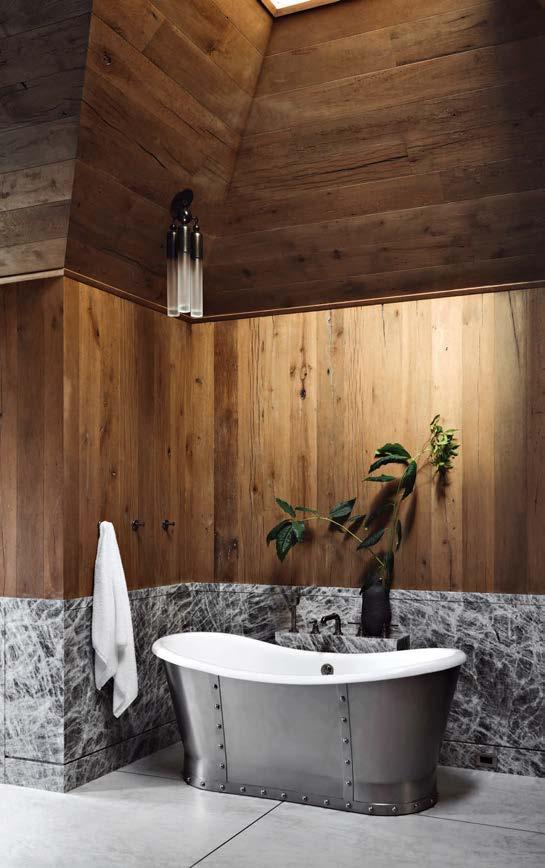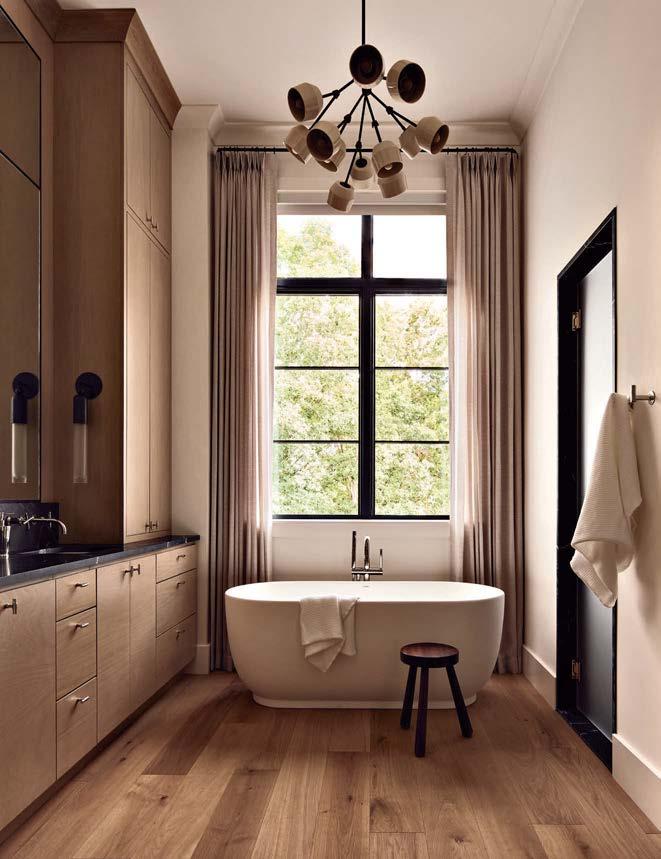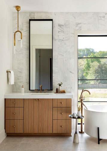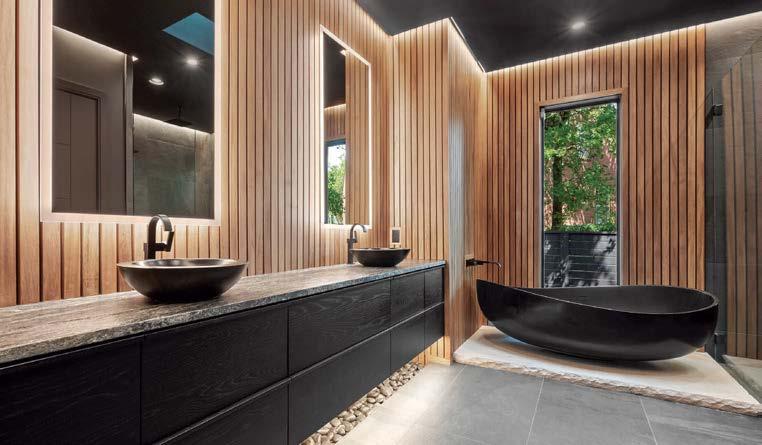 ABOVE An expansive vanity is just one of the many features that make this spa-inspired bathroom the ideal place to relax and unwind at the end of a long day. BOTTOM Wrapped in warm teak with a sculptural black tub as a centerpiece—and grounded by chiseled limestone—this moody primary bath exudes modern elegance. PHOTOGRAPHY Top left, Above + Bottom by AMY DIXON-DUDLEY; Portrait by SCOTT LEAMON