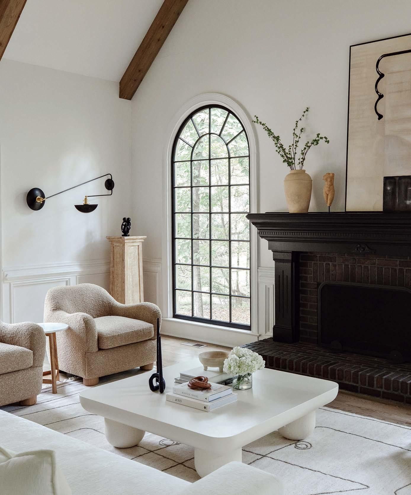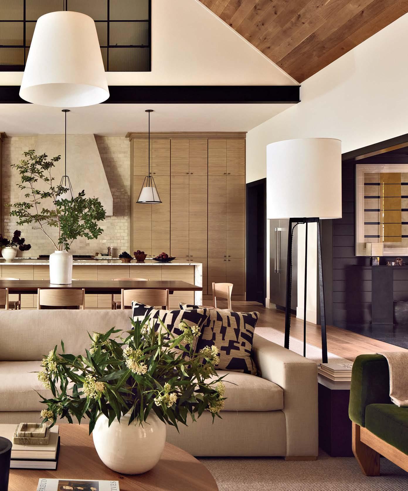 Opposite: To soften the scale, designer Jessica Davis carved out distinct zones in the great room. A custom Niba Designs rug grounds the living space beneath a Clad Home sofa and an RH coffee table.