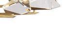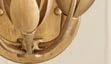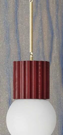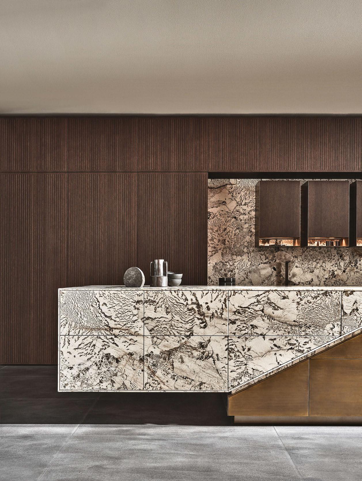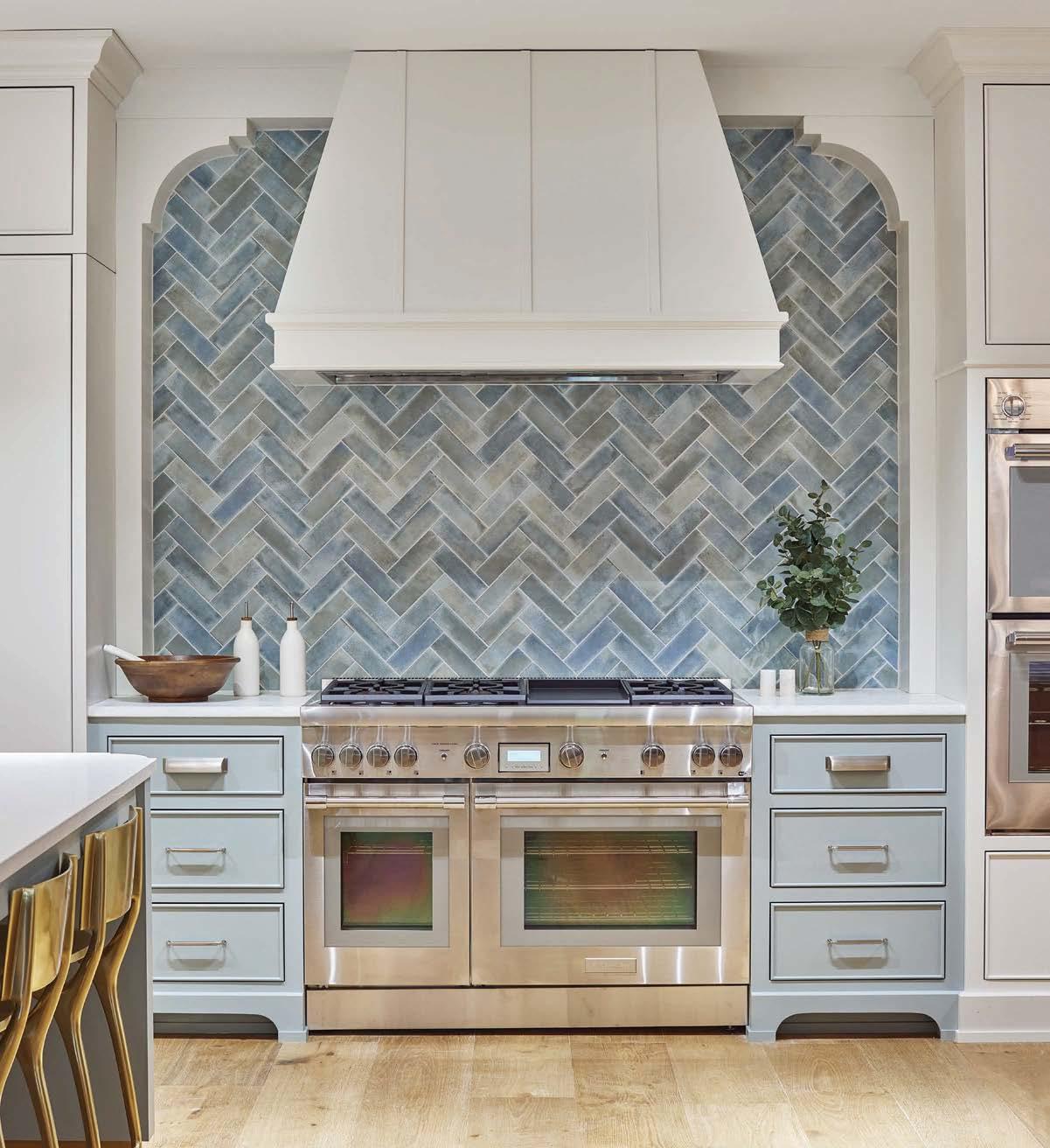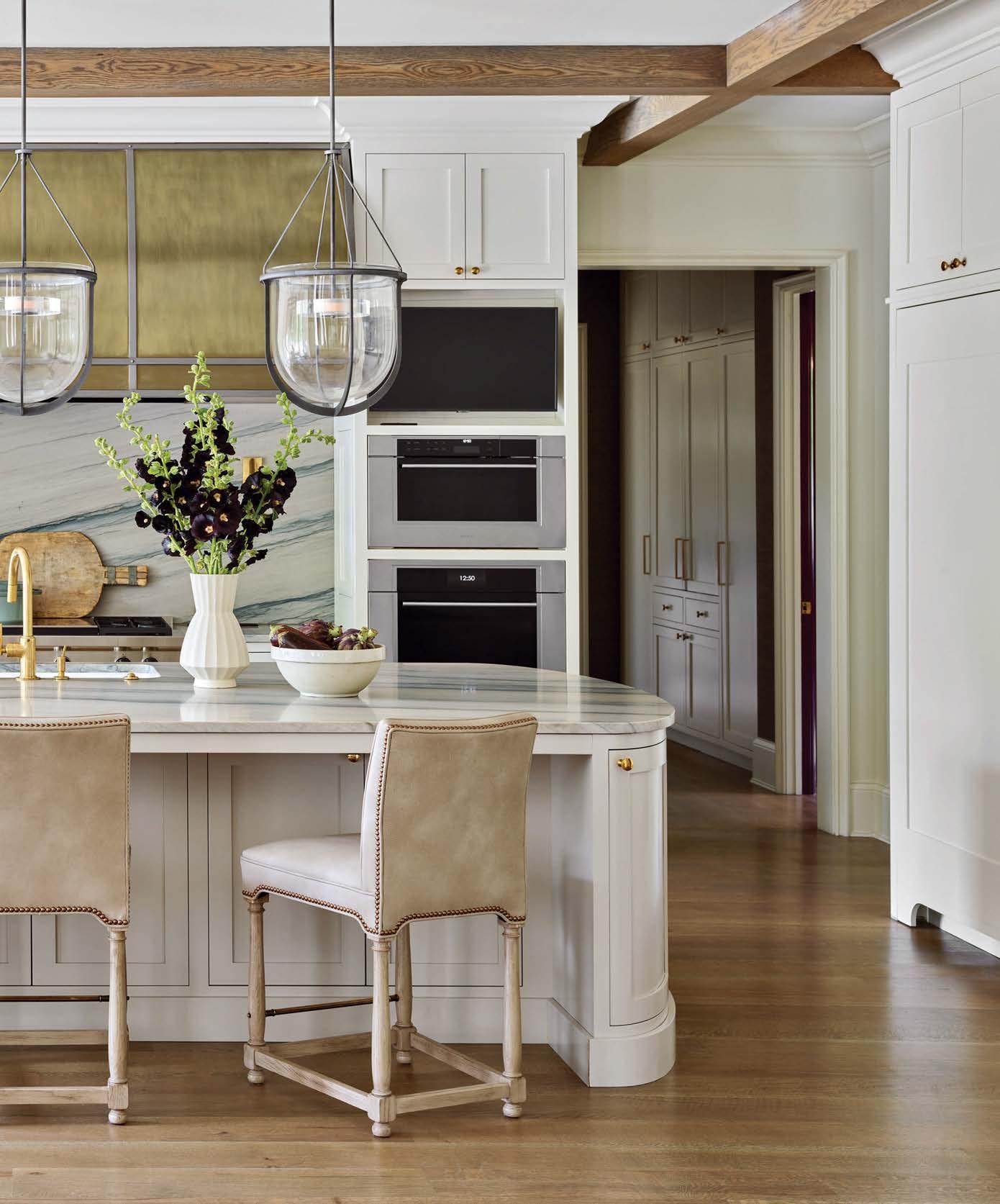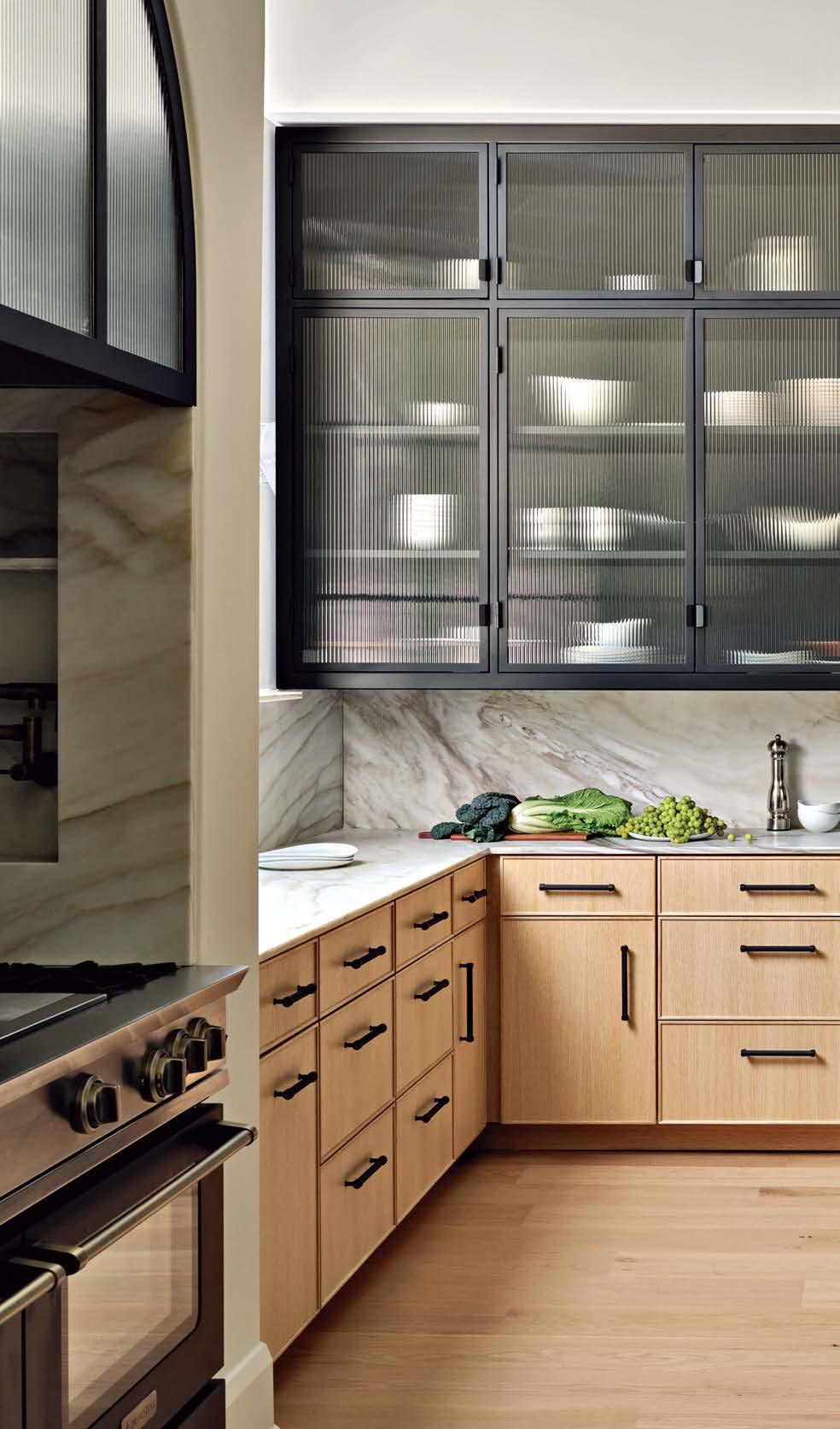A Juniper light illuminates one of the kitchen’s double islands. An arched element of black metal and reeded glass conceals the hood while accentuating the BlueStar range. The upper cabinetry was crafted by Tyler Jones.
