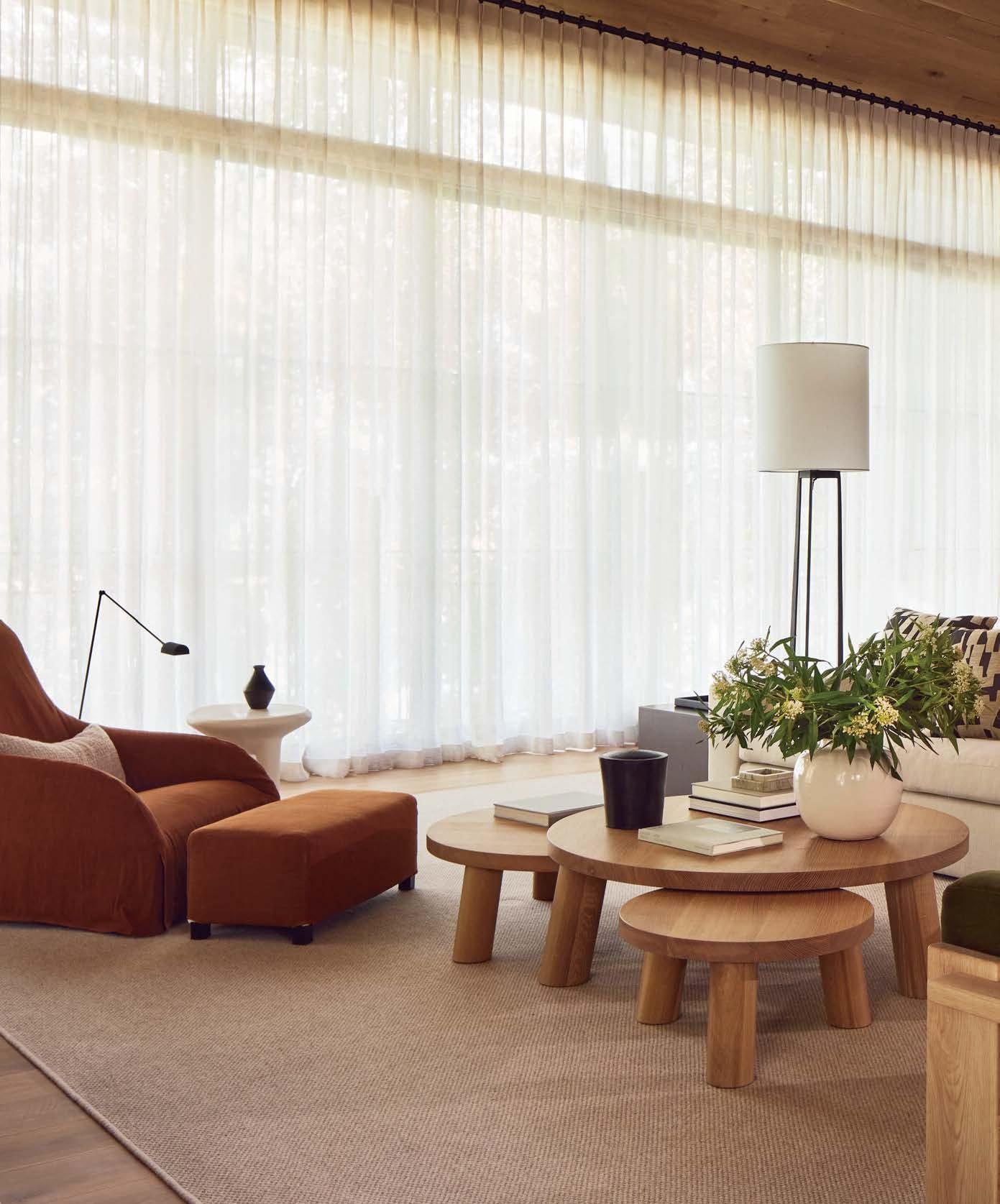Several additional pieces possess sinuous lines, underscoring their connection to the architecture. “We didn’t want anything to be completely rectilinear—we needed some softness and an organic feel,” Davis notes, pointing to the channel-stitched bench cushions, curved armchairs and biomorphic coffee tables.