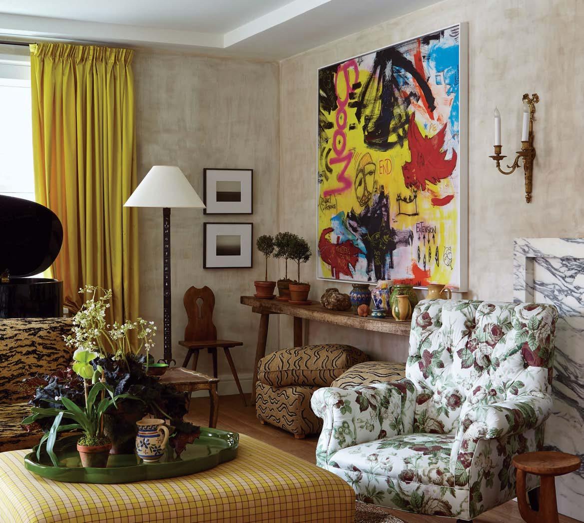 Previous page: On one end of the great room, the mirrored bar anchors another seating area composed of sofas from CB2 and a coffee table from West Elm. Daniel Batista paintings mingle with benches covered in a Perennials fabric.
