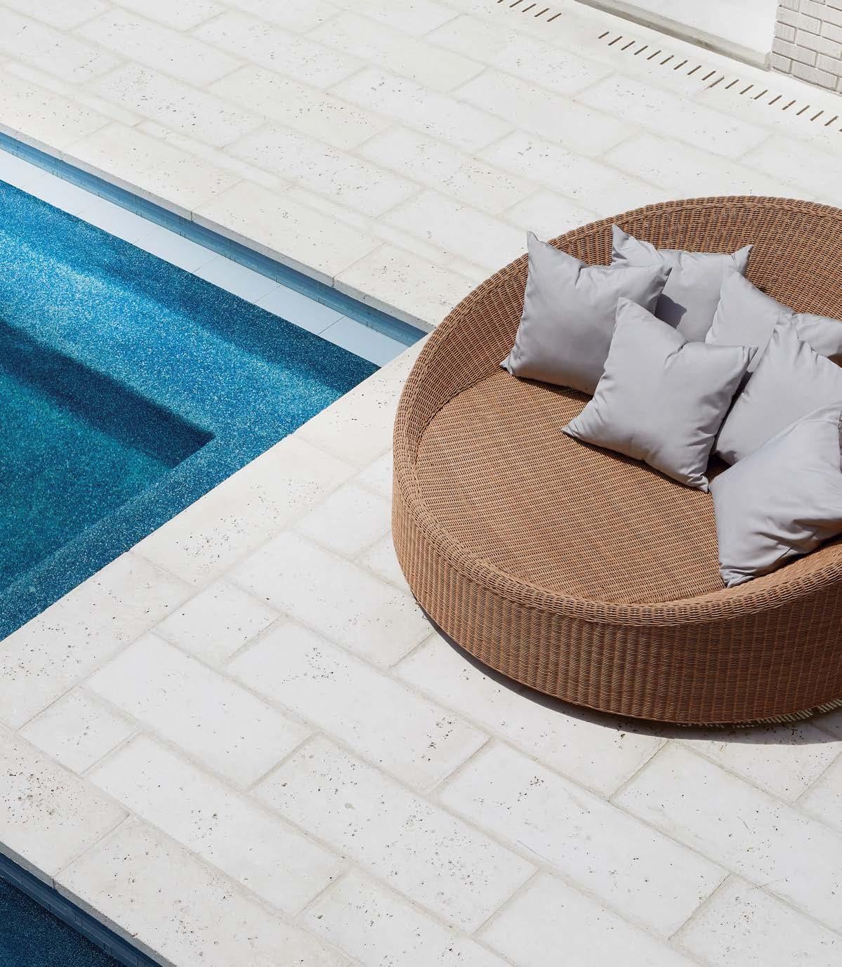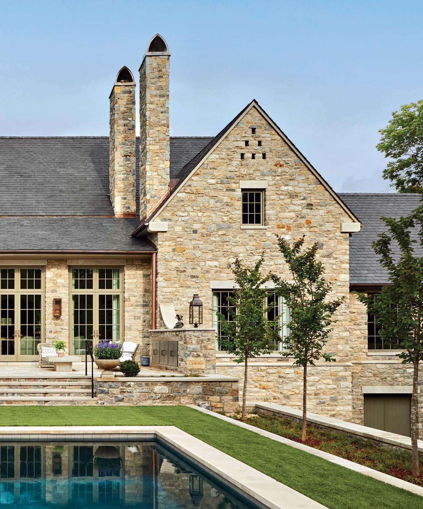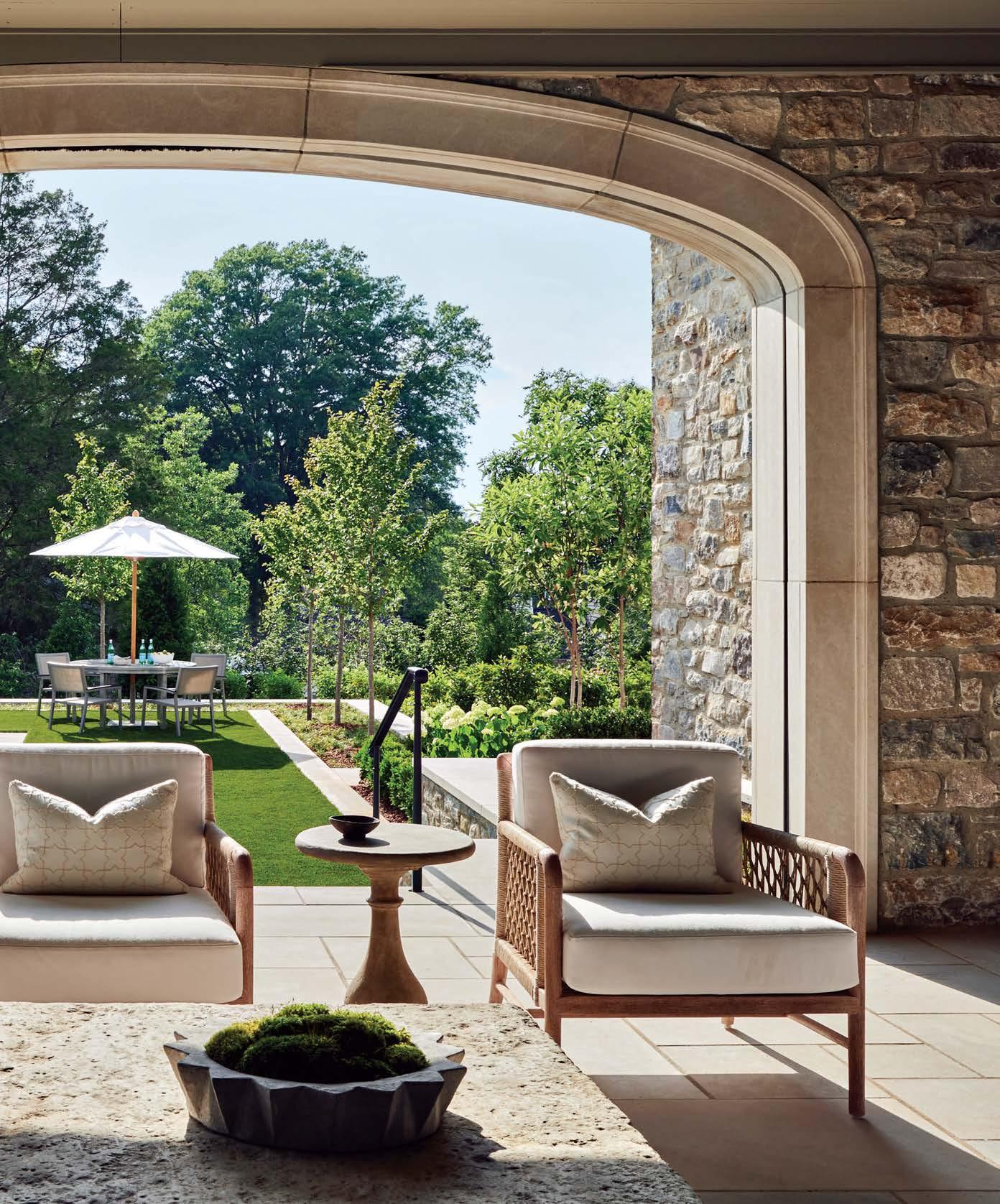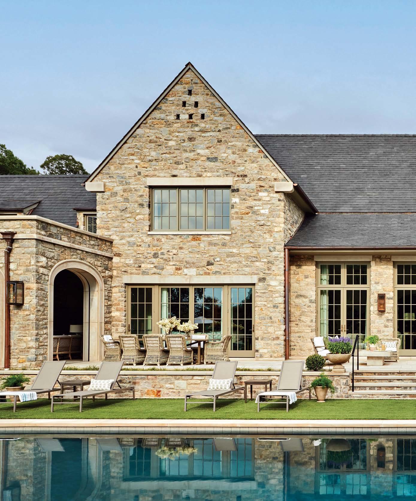 Indiana limestone and fieldstone cladding, architect Amanda Orr designed a generous pool terrace ideal for indoor-outdoor entertaining. The dining table, chairs and chaise lounges are by Janus et Cie.