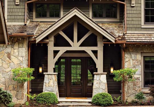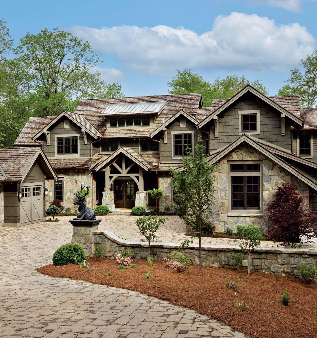 TOP LEFT A TrustStone Cherri planter with a seasonal composition adds a touch of elegance and greenery to the front entryway. ABOVE Lush greenery and a manicured fescue lawn blend this stone and wood-clad home seamlessly with its natural surroundings.