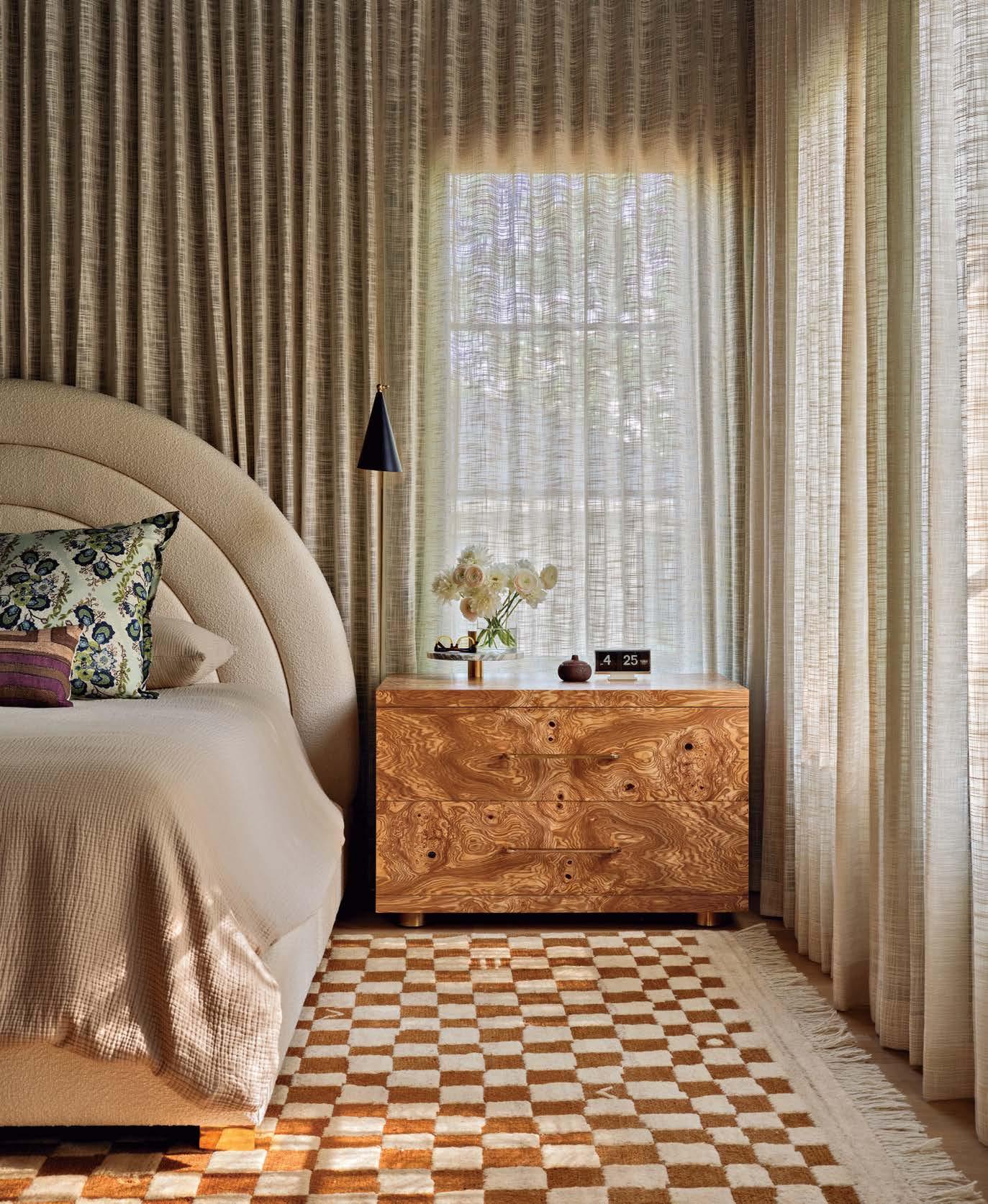 Opposite: Kravet sheers continue throughout the room, lending the cocoon-like feel the clients desired. A ModShop bed rests atop a checkered Lulu and Georgia rug, paired with a custom night table by Hancock Surface Studio.