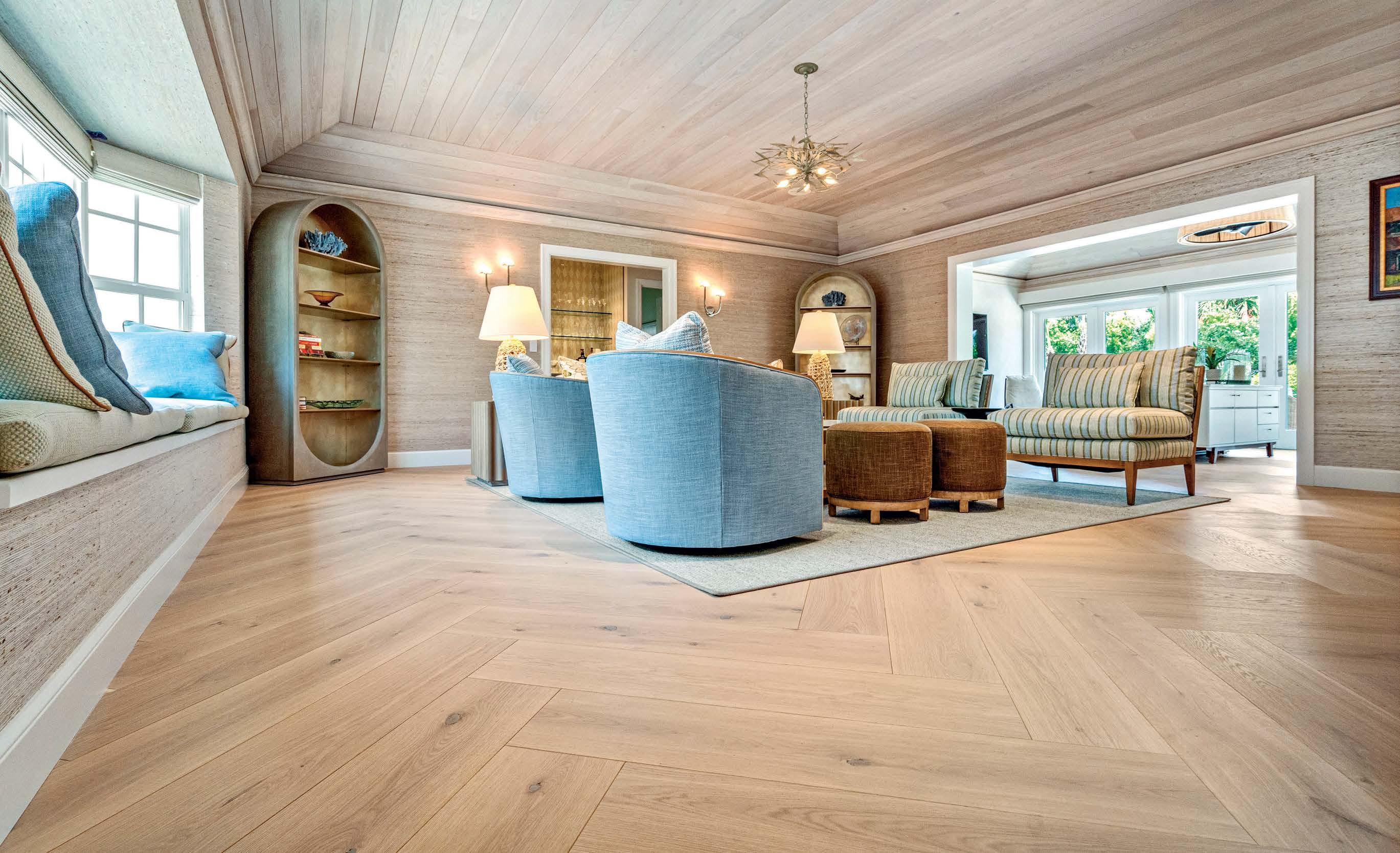 Cloud White OC-130, China White OC-141, Baby Fawn OC-15 and Pashmina AF-100 all feature in the beautifully bright kitchen. In the game room shown above, Cloud White OC-130 and Feather Down OC-6 complement a unique decorative application technique that mimics wood paneling.