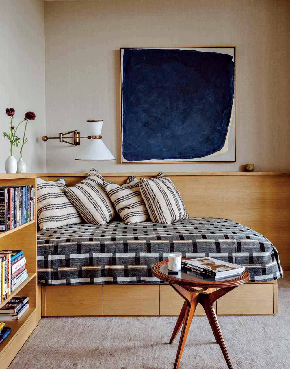 Above: Pillows in Larsen’s Bautista fabric from Cowtan & Tout and a Sacco Carpet floor covering accent the study’s built-in daybed and shelving. The design team sourced the side table and Kobis & Lorence wall sconce from 1stdibs. Kim Fonder artwork hangs against Aesthetics Wallcoverings’ Camden linen.
