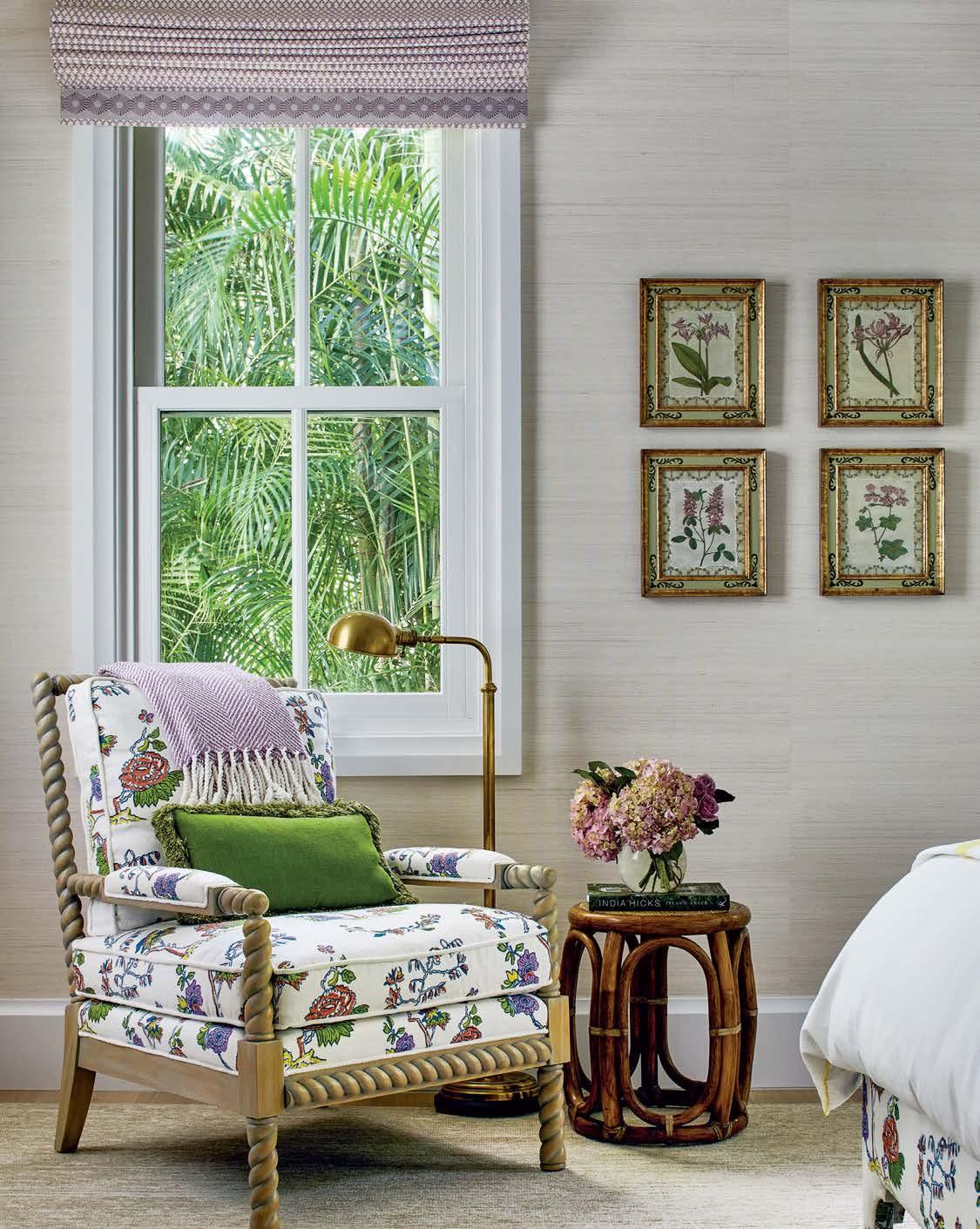 Brunschwig & Fils fabric from Kravet covers the living area’s Liz O’Brien armchairs. Harbinger by Hand’s Gould cocktail table rests beneath Coleen & Company’s Josephine lantern. A mirror from Palm Beach Home Style joins benches and a side table from 1stdibs.