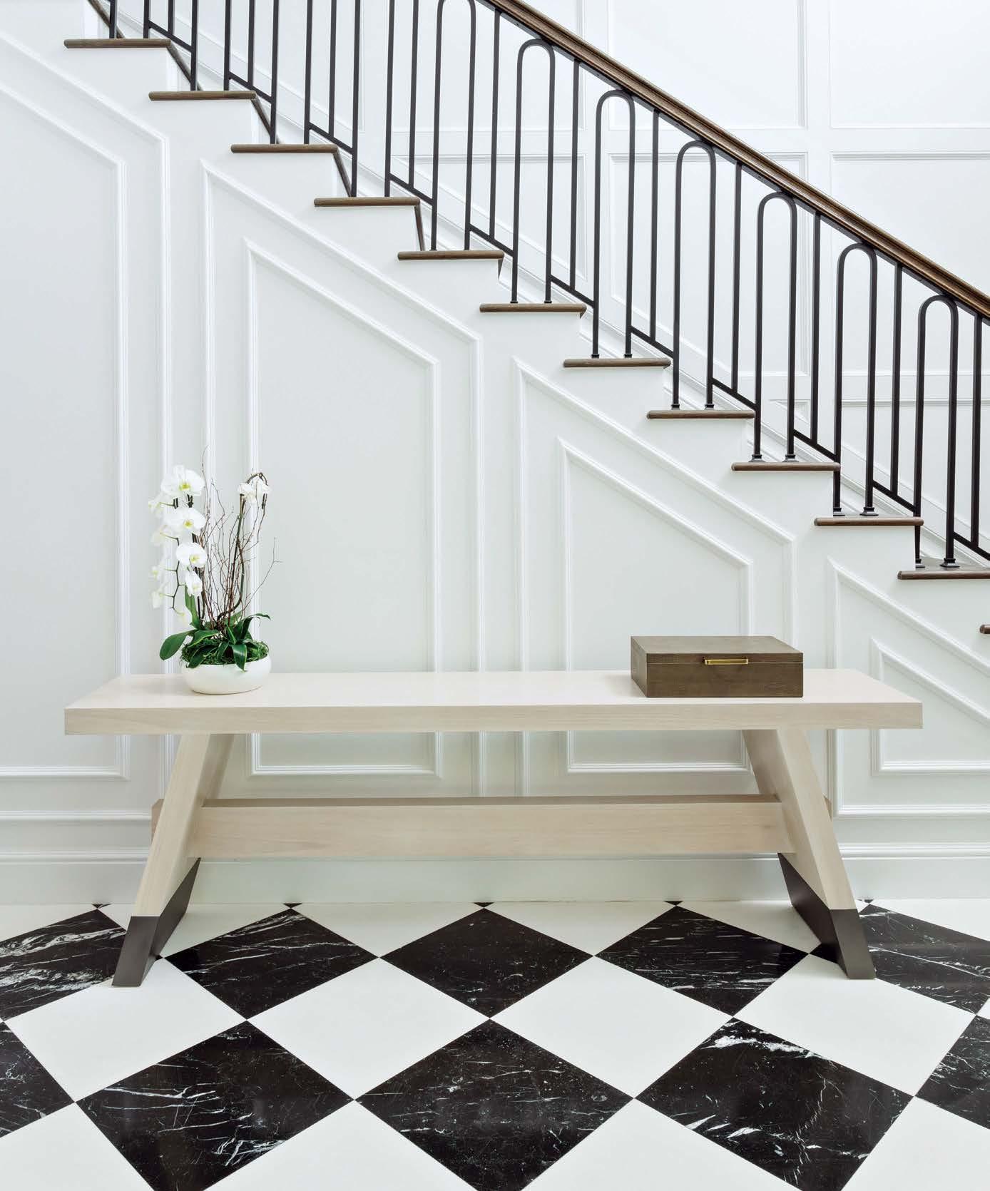 Leading to a Don Griffin artwork, Nasco terrazzo flooring warms the entry hall, crowned by a CB2 flush mount. Against a wall painted Benjamin Moore’s Athena, a custom shelf and mirror