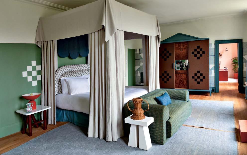 Above: Dedar’s Pazl wallcovering enlivens the guest bedroom, punctuated by Dirk Knibbe’s Compound Cream Finelines constructed the draperies using Rogers & Goffigon’s Morse textile. Léon Léon Design’s George chandelier floats above a Murano lamp, while Gloster’s Arbor side table occupies the balcony.