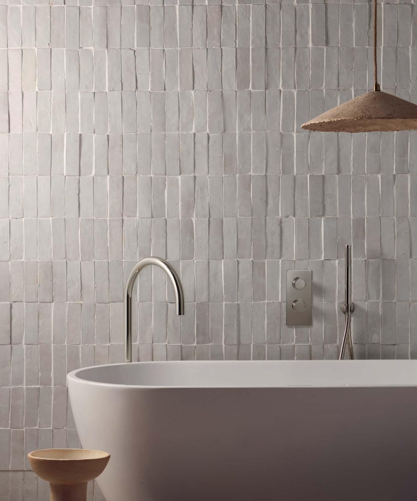 Left: The riveted finish of the porcelain backsplash from Cavastone brings texture to the kitchen. Countertops of Opustone Stone & Tile Concept’s City White engineered stone contribute to the tactile mix.