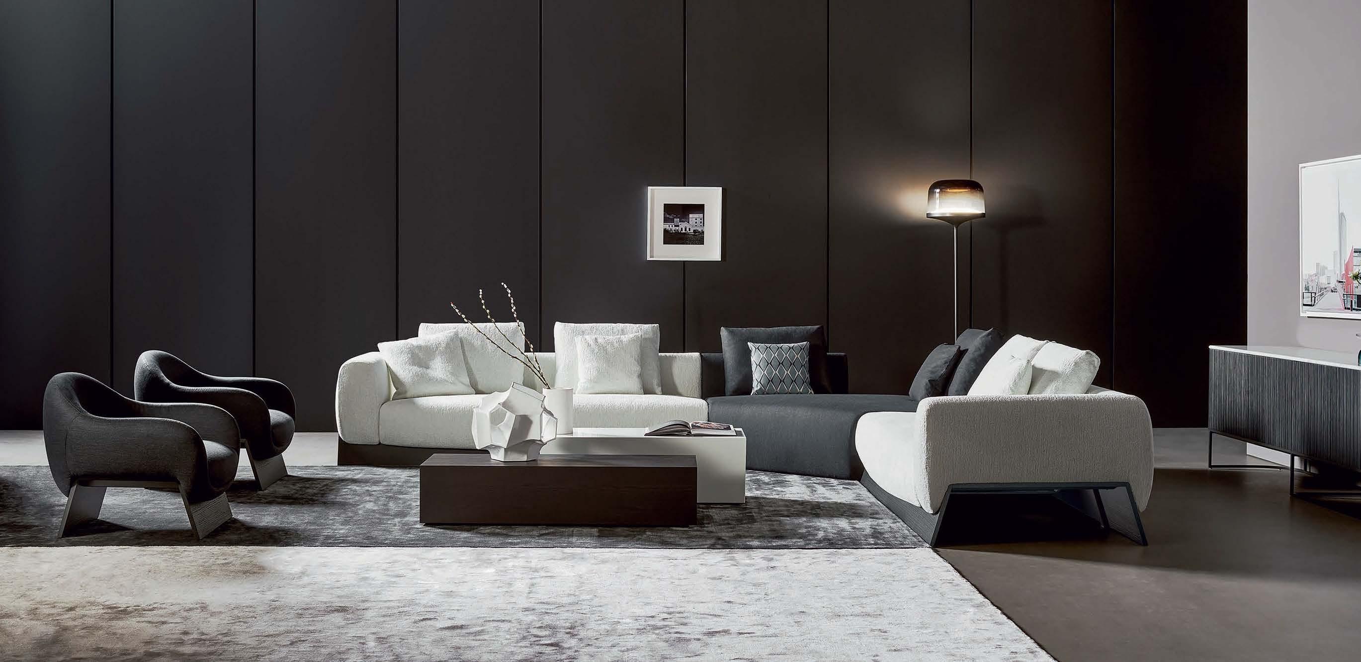 Sonneman’s Liquid chandelier from International Design Source dangles in the entry hall. The three-dimensional white oak trim, outfitted with LED lighting, complements a Phillip Jeffries vinyl-wicker wallcovering. Perennials’ Landscape Tibetan Knot runner leads to the living area.