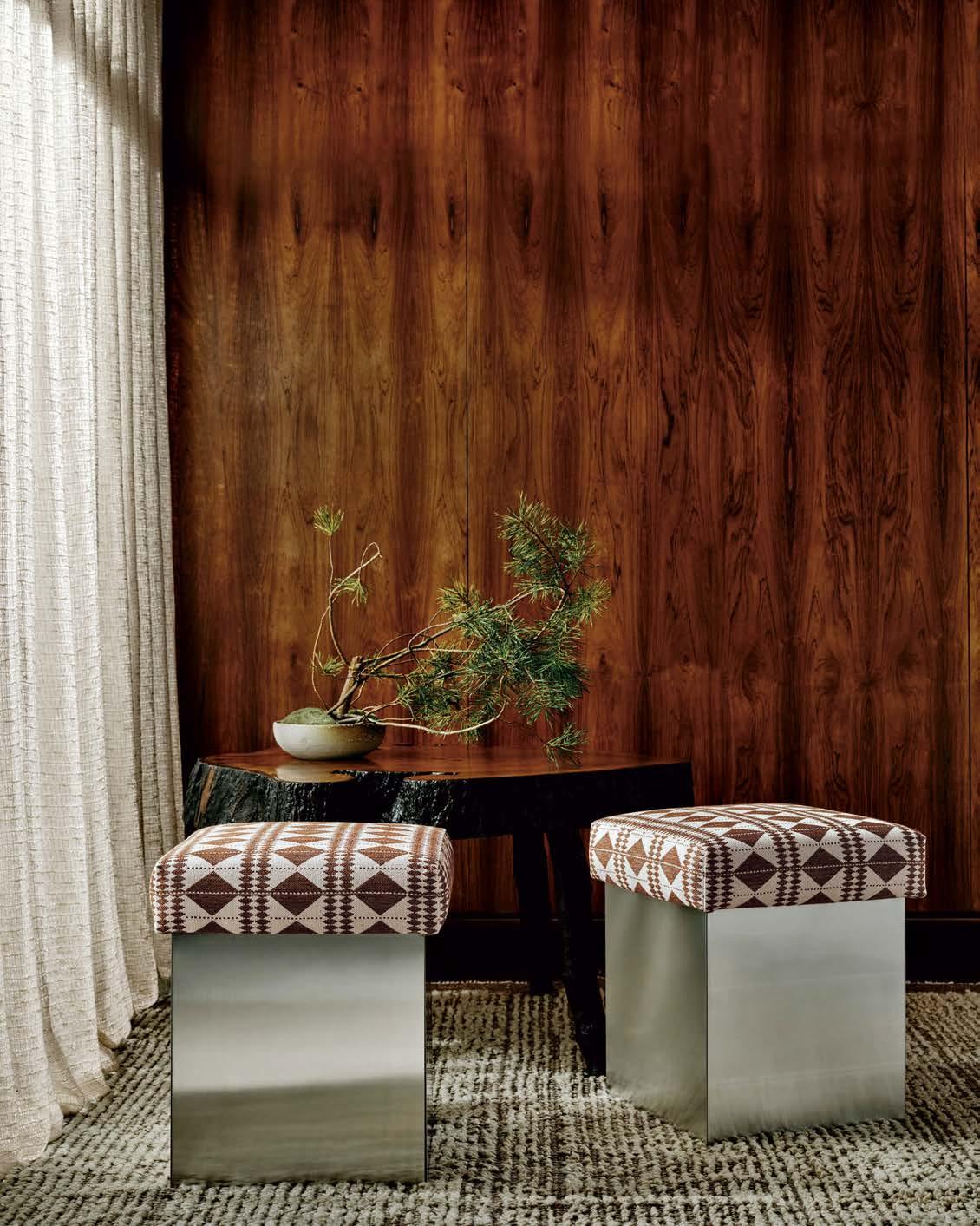out how to design two spaces that relate to one another but don’t have the same layout,” JacobsBrichford explains. Paying attention to scale and using materials such as wood, rope and durable upholstery ensured a cohesive look when the living area’s retractable doors are open, connecting the space to the terrace. “You can go from the pool to watching TV to eating dinner,” Goldman observes.