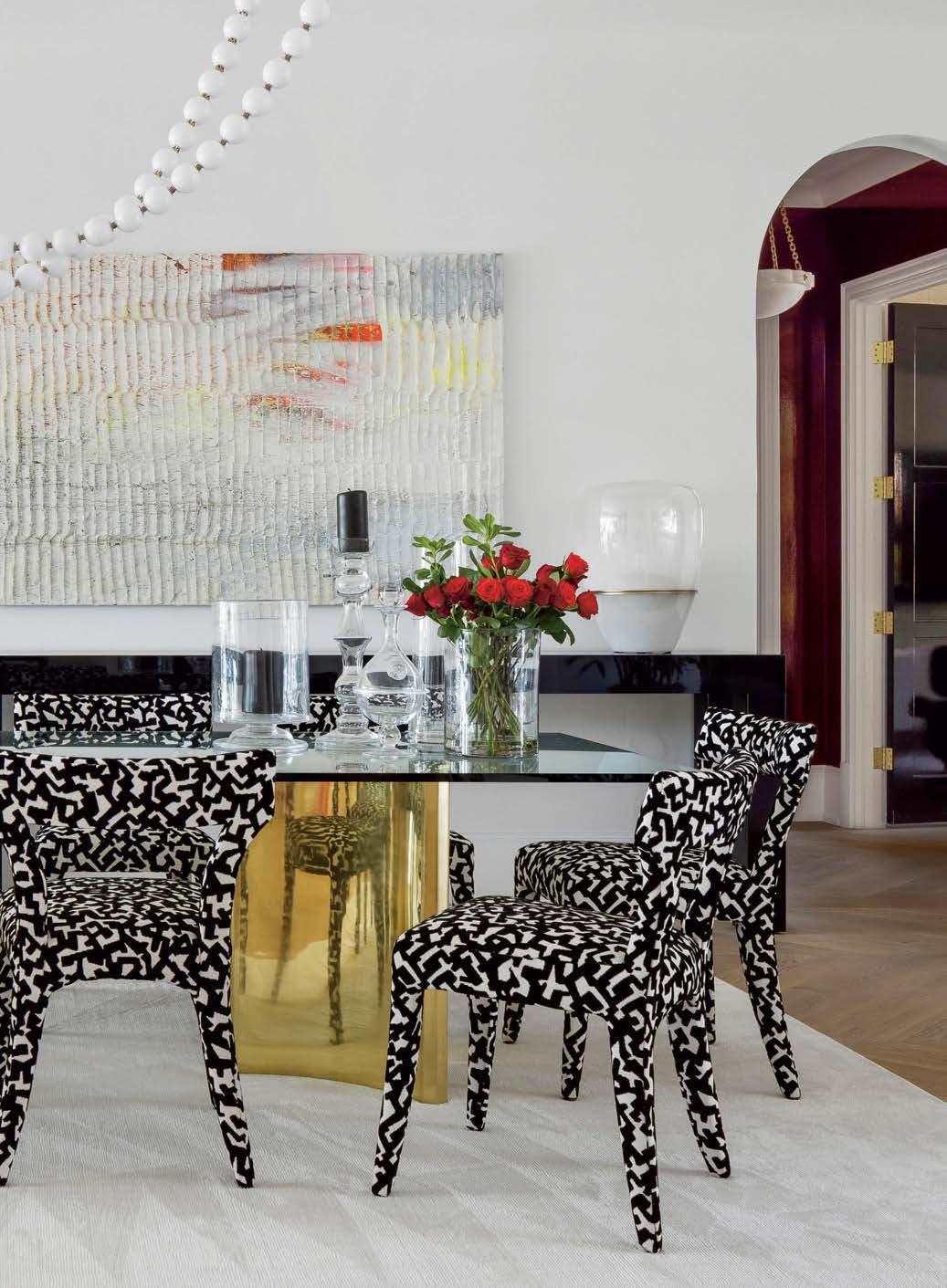 The lounge’s tones are among the punches of cheery pigments the Hogans requested amid a primarily watery palette. “It was important to them to bring in bold splashes of color—and to not be shy about it,” the interior designer says. “We intended to embrace the setting without feeling like you’re walking into a coastal home.” The residence’s range of carefully selected blues includes a turquoise vinyl wallpaper in the dining area— a bold transformation, as the wall originally contained a window that looked out to a nearby building. “I knew from the first time I walked in there, I would close in that window,” Murphy states. “The wallcovering is cool and comforting, and the texture gives movement and light reflection.” Instead of offering a view of a concrete structure, the space now exhibits colorful artwork, dalmatianprint chairs and a wall-to-wall refrigerated buffet with a reeded exterior.
