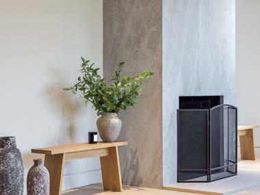 But if the crowd craves a cozier place to enjoy a meal or a cocktail, the dining room—with its deepgreen, hand-glazed walls—is the place to be. “It’s an evening room,” Carrier explains. “Our ethos is to go dark in that type of internal space to create the right atmosphere.” The moody wall color also works to offset the art. “You can see how beautifully the pieces respond to that green,” he says. For contrast, the ceiling was given a mint lacquer treatment and the 12-seater dining table was paired with chairs upholstered in tomato-red leather. And, since the clients wanted a more intimate option for enjoying meals together, Carrier and Miller installed a banquette and marble pedestal table at the far end of the room. “It’s like a cozy booth at your favorite restaurant,” Carrier muses.