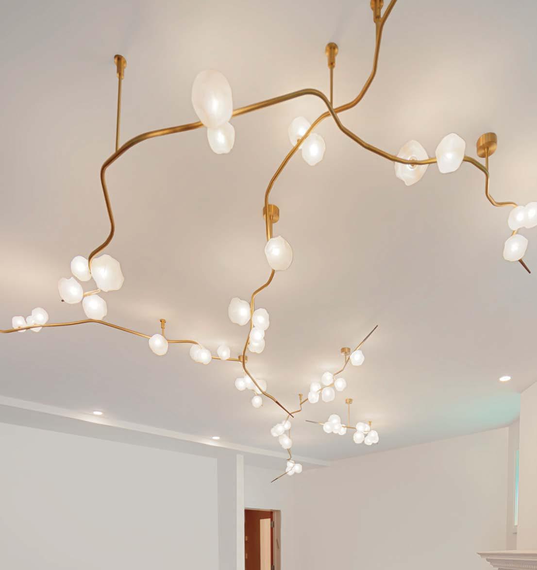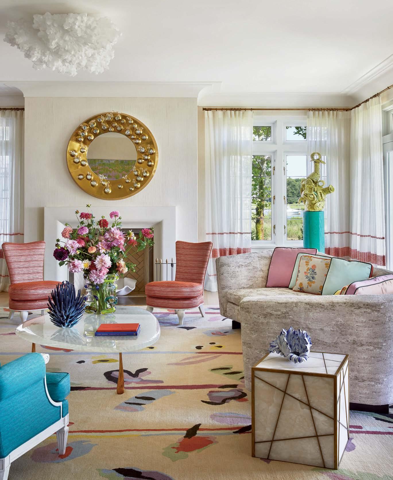 pieces and wove “a little bit of every color in every room, so each space feels surprising and new, but like an iteration on a theme.” Though rugs ground the interiors, whimsical lighting elevates them, thanks to the client’s wish for “showstopper fixtures in every room,” the designer says. She obliged with fanciful selections, including a cloud-like, organza-wrapped living room light sculpture by Ayala Serfaty and a dazzling bespoke dandelion chandelier by Studio Drift in the dining room. Blossom motifs are repeated in Hamilton’s custom-designed chair fabric, which was handembroidered in Portugal.