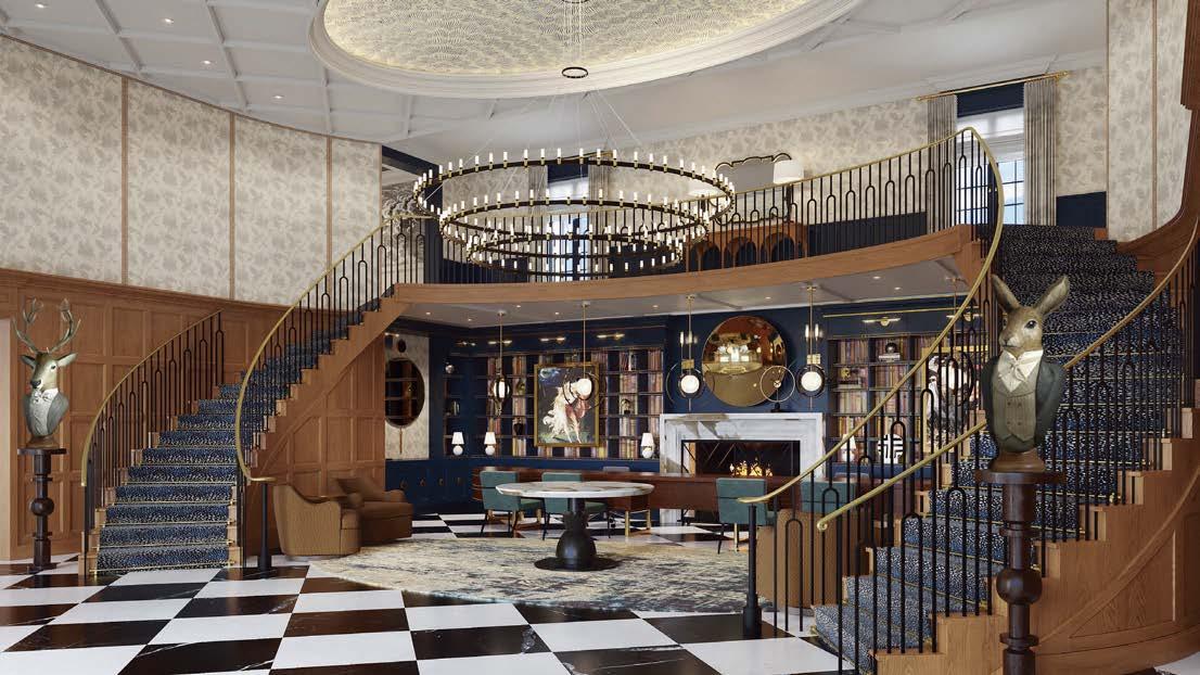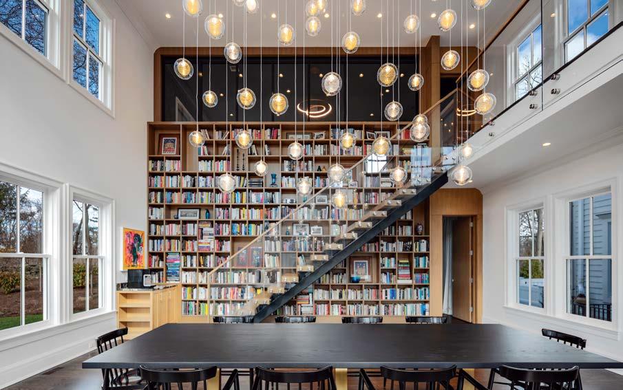 Off the grand stair hall, the leather-andwood library pays homage to a favorite haunt of the owners—Bar Hemingway at the Ritz Paris—while an upstairs sitting room takes its inspiration from Jules Verne’s famed sci-fi novel, Twenty Thousand Leagues Under the Sea. “The deep-blue walls and sofa fabric reference the ocean, while the beautiful, vaulted ceiling and undulating lines reflect gestures on the exterior. It’s a great, cocoon-like room for evening gatherings,” Hamilton notes, adding that her client wanted an “interesting, lively” residence, with each space offering a different experience, “so no one would get bored.”