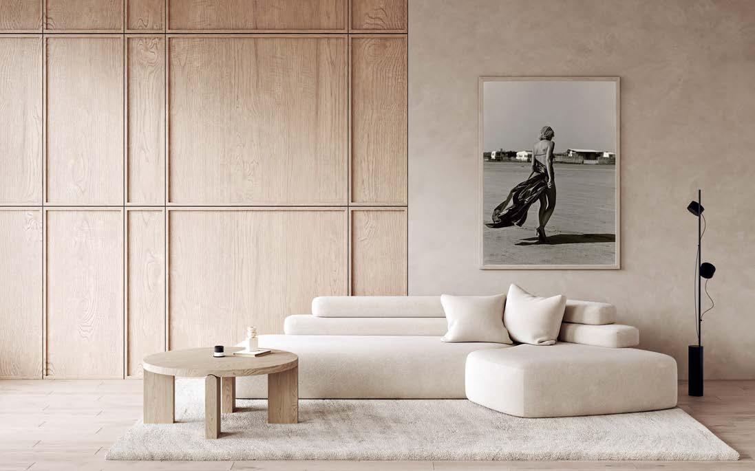 The living room exudes modern simplicity courtesy of a Camerich gray sectional, custom Voce Di oak coffee table and TLC Home alpaca rug. Inspired by fishing nets, a Kenneth Cobonpue Dragnet lounge chair alludes to the coastal environs.
