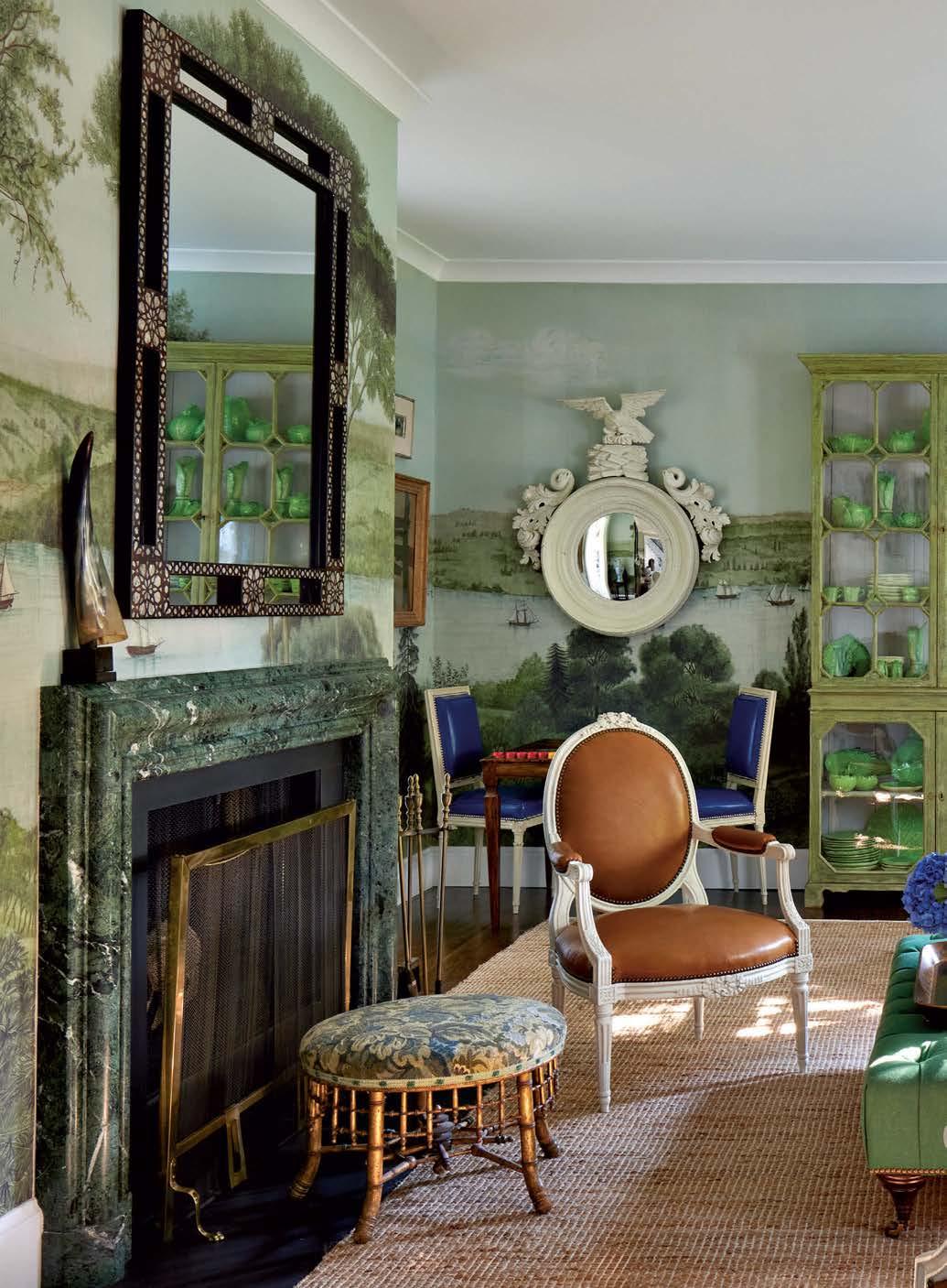 fireplaces for bolection-style surrounds and employed layers of paint, wallcoverings, window treatments and rugs to lend each space its own distinct narrative. “They love to entertain, and Michael didn’t want it to feel like you’re encountering the same room over and over again,” Olsen offers.