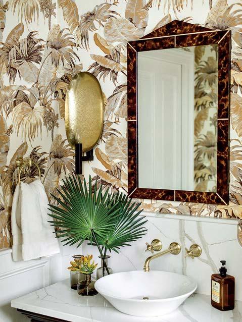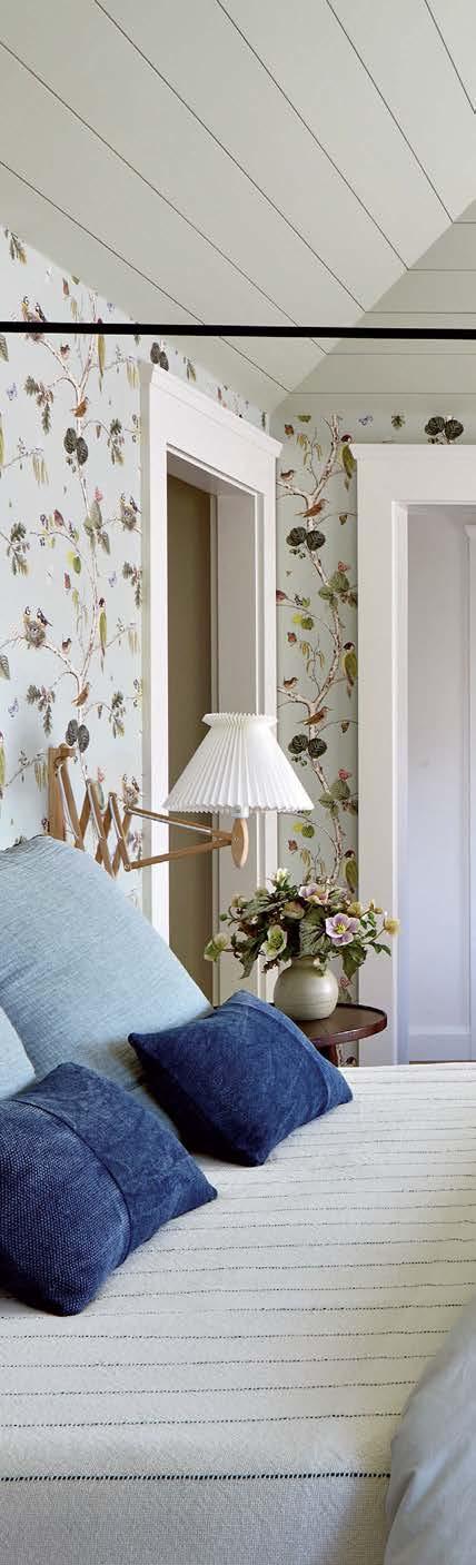 Moving upstairs, the home’s bedroom suites offer tranquil escapes as well, each boasting a distinct personality (for instance, a medley of blue-and-white textiles wrapped in a birdpatterned wallpaper for a guest room) and embellished with Ricci’s signature finishing touches. “I like to bring in vintage Danish lamps and textured fabrics,” Ricci notes. Summing up the secret sauce of this special project, she continues: “The key here was to layer, but not over-layer. There is a refinement to this house that makes it just glow.”