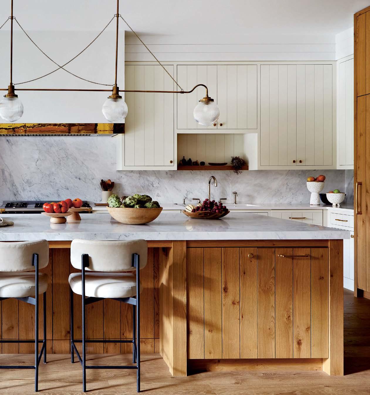Separated from the living area by a set of steel-and-glass doors, the kitchen is an equally important hub for the family, who loves to cook, bake and hang out around the eat-in island. Here, a combination of painted-cream and natural oak cabinetry provides a warm backdrop and, notes Ricci, “the vertical boards were chosen as another nod to cottage style.”
