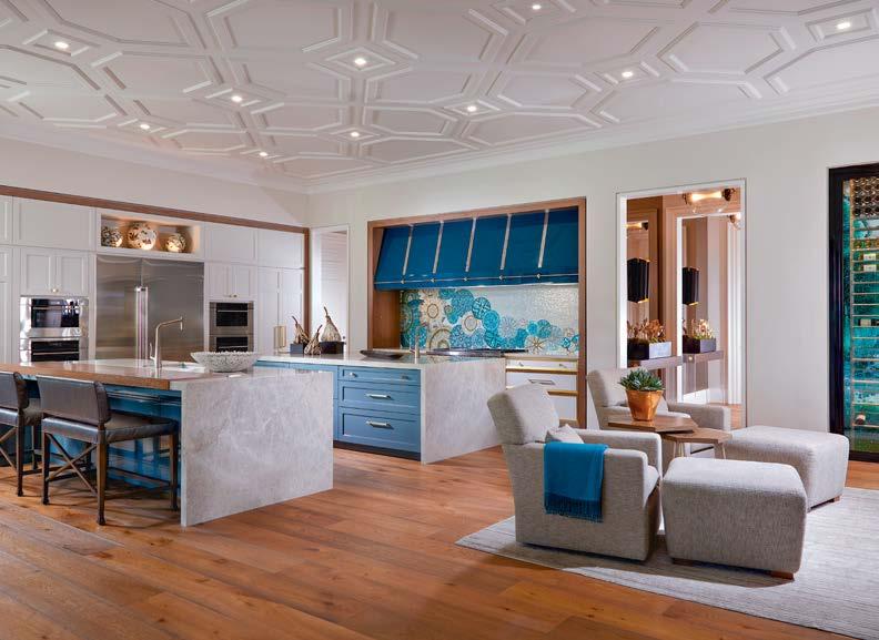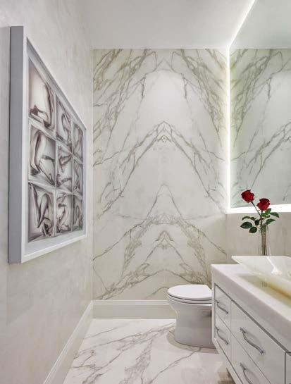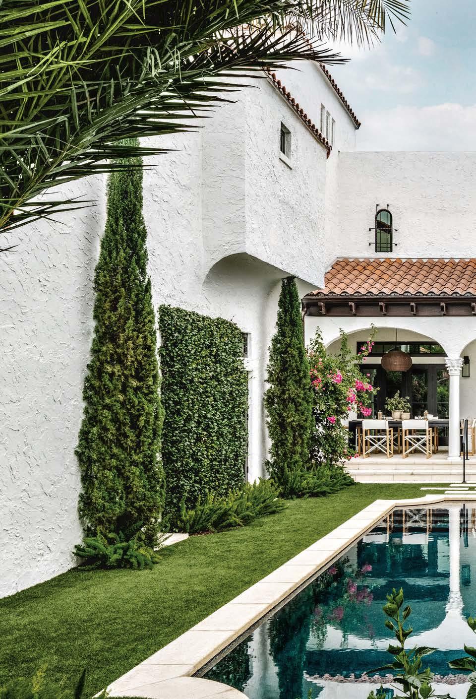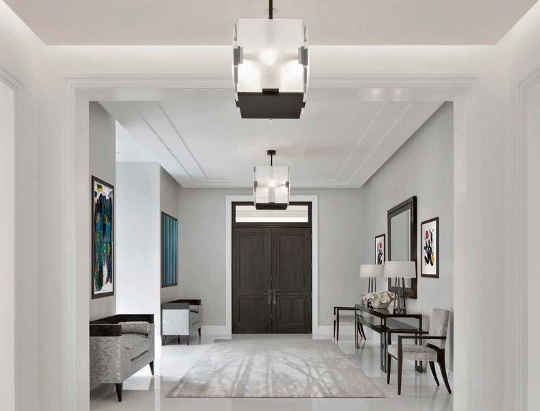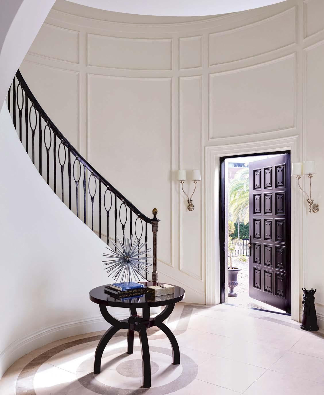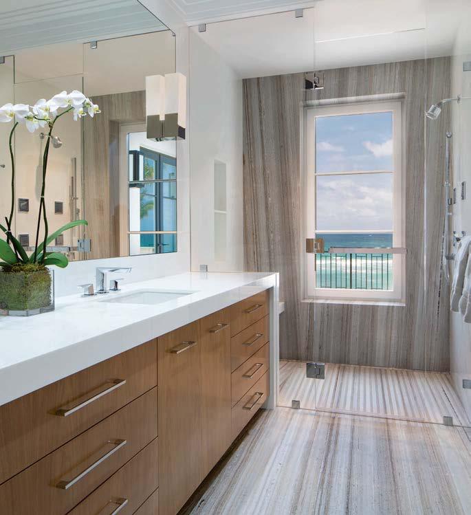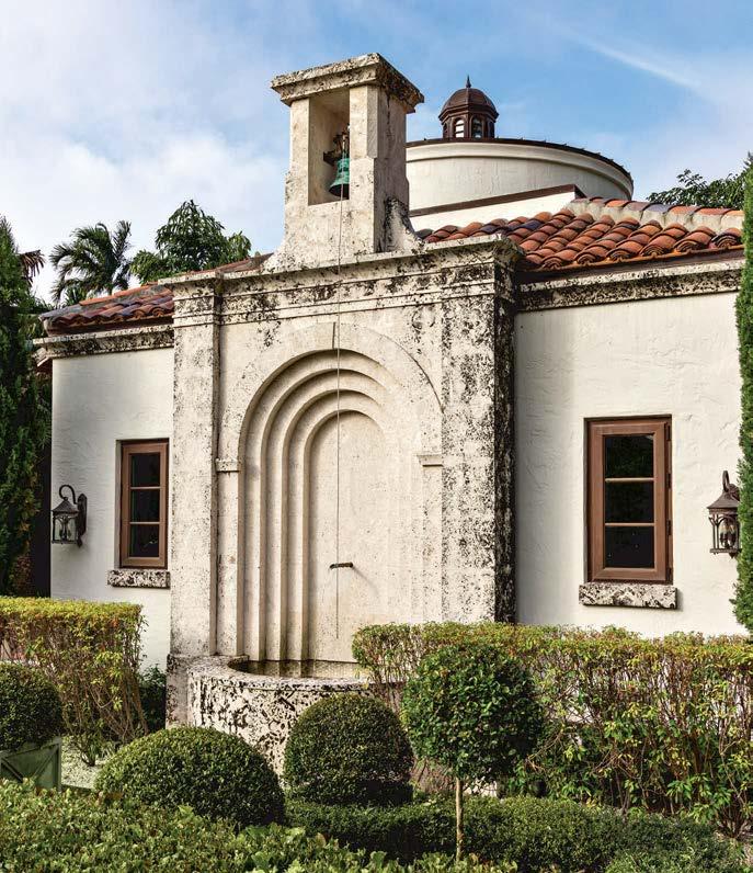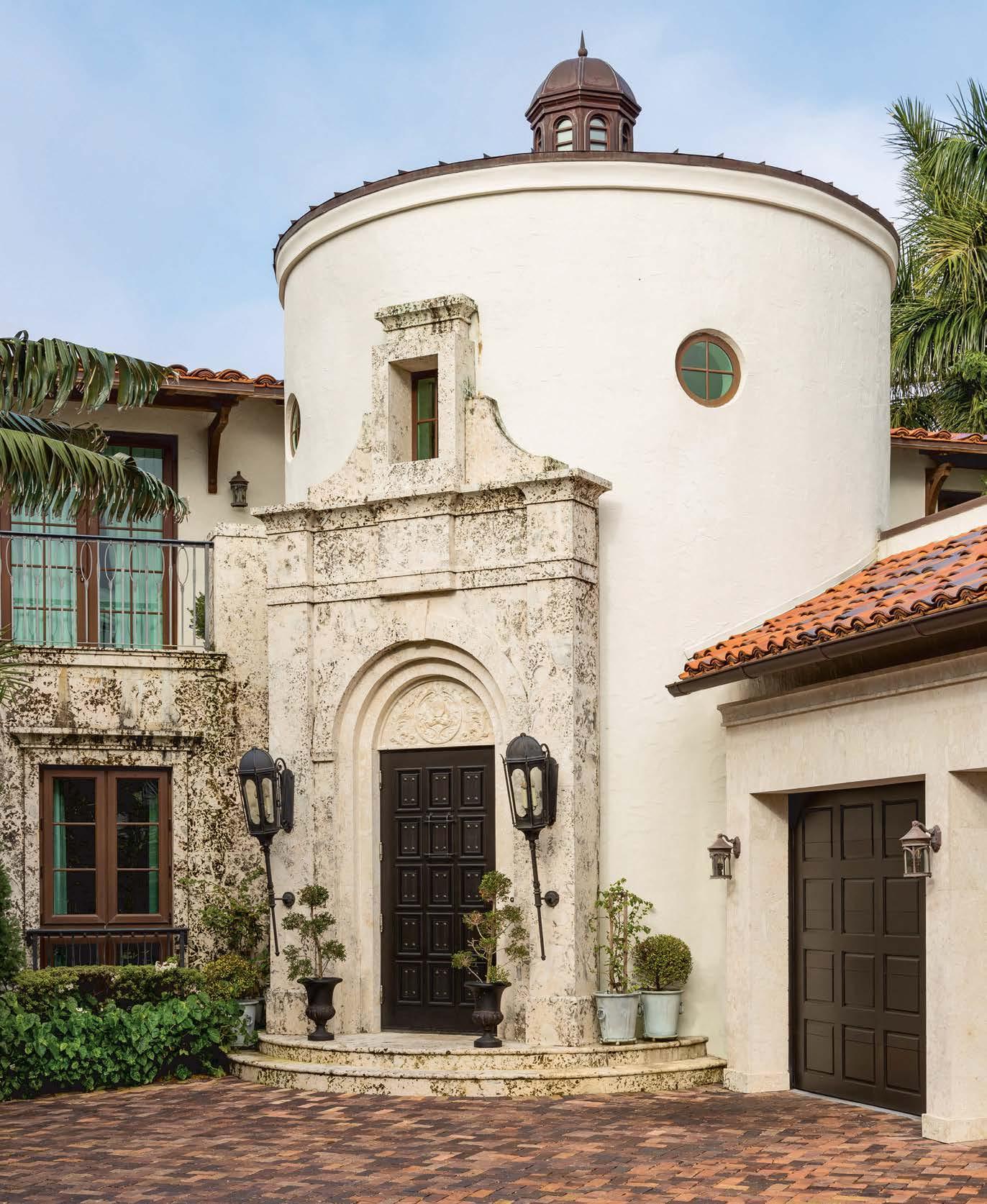 At first glance, Tracy and Alisa Bahl’s Mediterraneanstyle house looks every bit a part of South Florida’s architectural legacy. There’s coral-stone trim around the windows and cornices, a tile roof, a rotunda and even a bell tower. Step into the luminous entry, however, and the clean lines and bold juxtapositions signal that this Old Worldstyle residence is, in fact, a new build. Crisp white wainscoting opposes the steel balustrade on the dramatic curving staircase leading to the second floor, while the creamy tiles underfoot are accented with graphic details in dark stone, continuing the length of the adjacent gallery hall. “The exterior is traditional, but inside, it’s a completely different feeling,” says designer Susan Bednar Long. “The owners wanted a classic but updated look, so that contrast was intentional.”