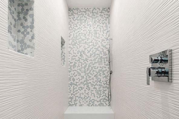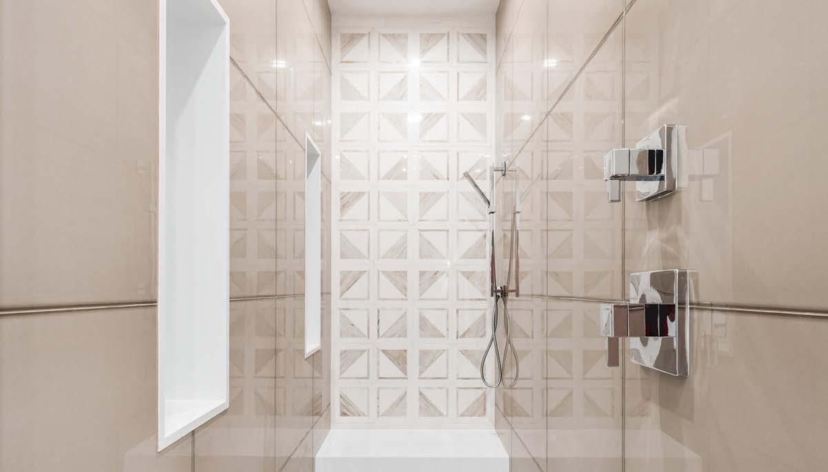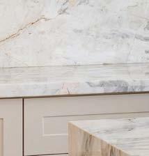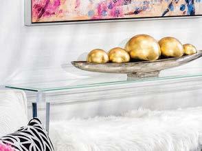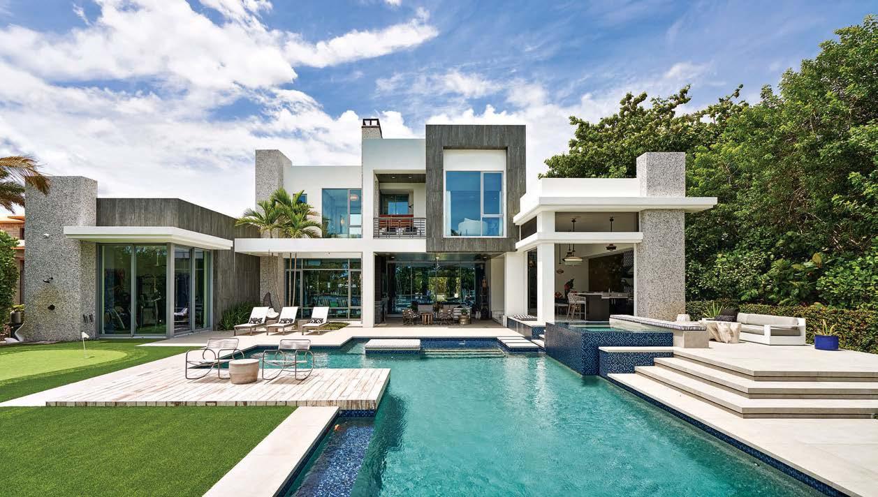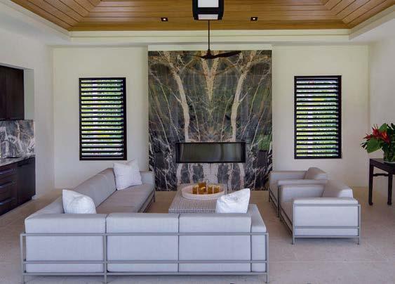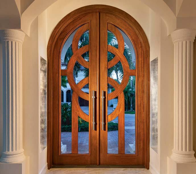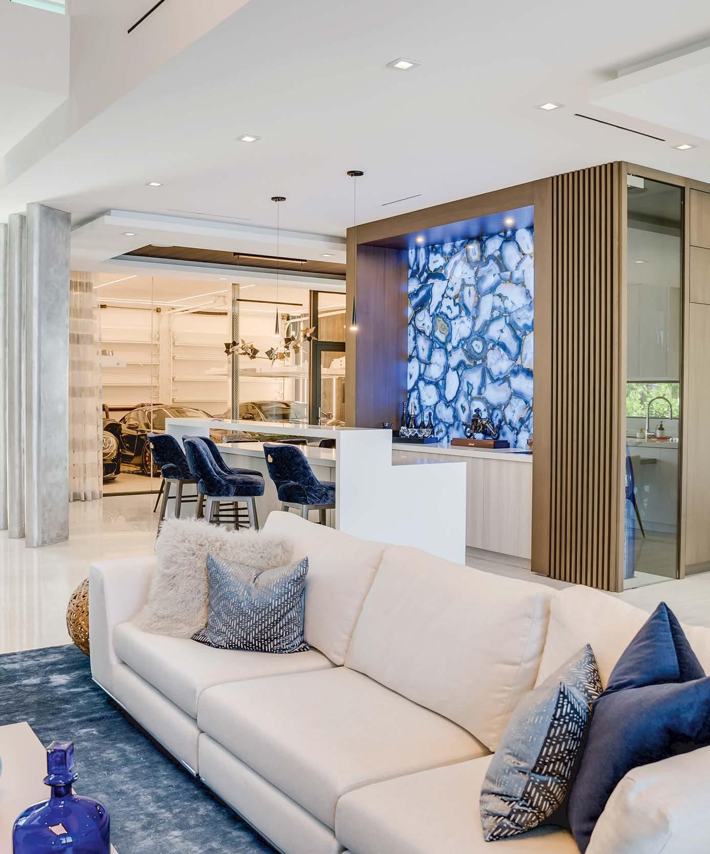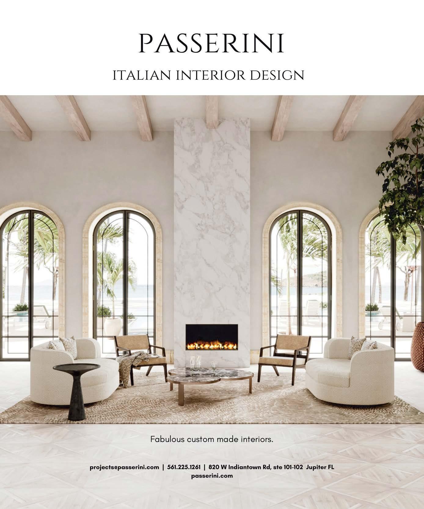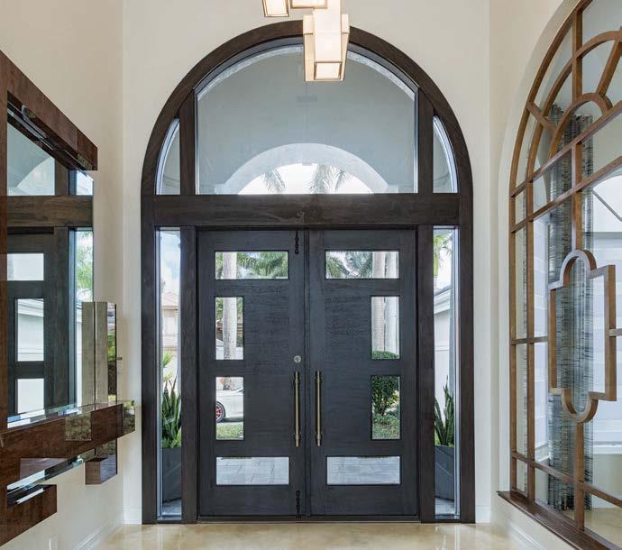 At first glance, Tracy and Alisa Bahl’s Mediterraneanstyle house looks every bit a part of South Florida’s architectural legacy. There’s coral-stone trim around the windows and cornices, a tile roof, a rotunda and even a bell tower. Step into the luminous entry, however, and the clean lines and bold juxtapositions signal that this Old Worldstyle residence is, in fact, a new build. Crisp white wainscoting opposes the steel balustrade on the dramatic curving staircase leading to the second floor, while the creamy tiles underfoot are accented with graphic details in dark stone, continuing the length of the adjacent gallery hall. “The exterior is traditional, but inside, it’s a completely different feeling,” says designer Susan Bednar Long. “The owners wanted a classic but updated look, so that contrast was intentional.”