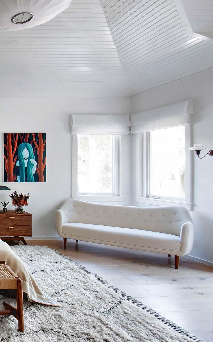 Above: A Blu Dot sofa gathers with Gabby’s Eleanor table and a TCS Designs, Inc. armchair in a guest bedroom. Made Goods’ Conrad nightstand partners with Oly’s Faline bed. Surya’s Temple rug lays on painted white wood flooring. Robert Abbey’s Aiden lamp completes the scene.