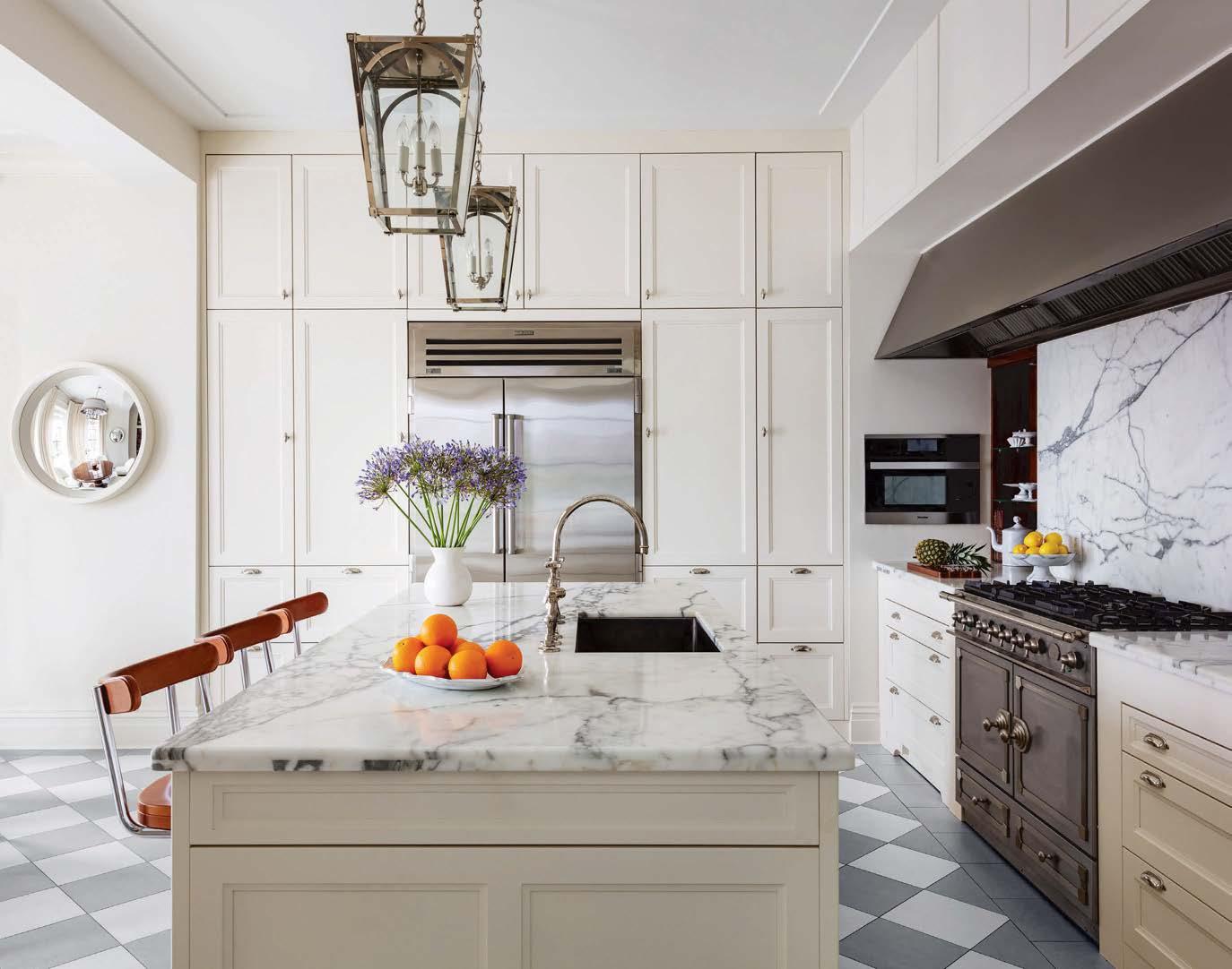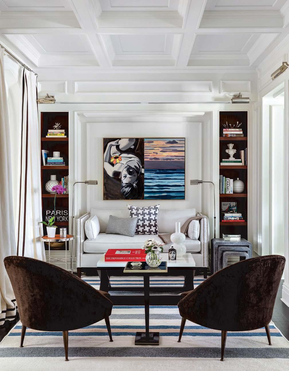 Kelly Wearstler’s Strada chandelier crowns the living room, home to Global Views armchairs, Holland & Sherry’s Evelyn rug and a Gabby side table. Ralph Lauren Home lamps top White on White cabinets near Estro sconces. The settee and coffee table are custom.