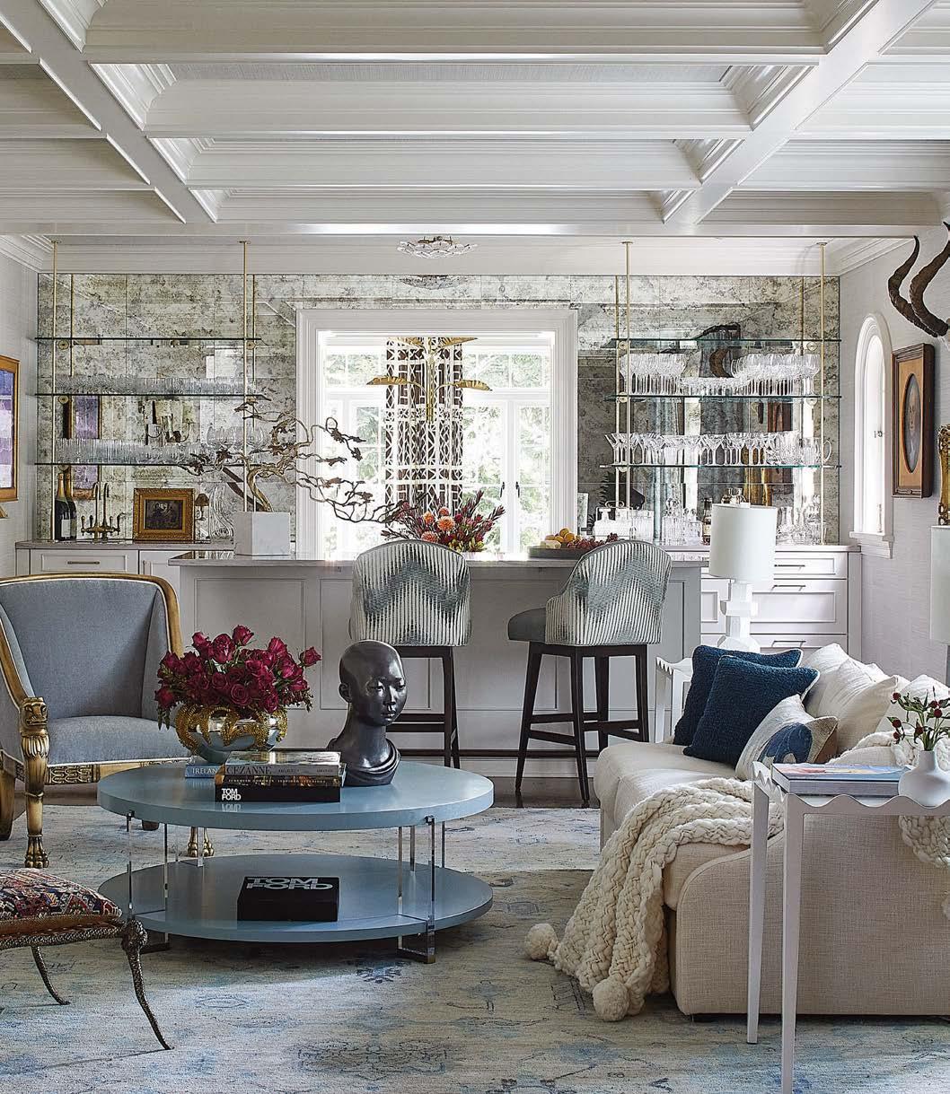 For the interiors, Long took her cues from one of the couple’s favorite European getaways, the J.K. Place Capri, which offers a fresh take on traditional Italian design. She embraced the challenge of creating an atmosphere that would spotlight their growing art collection while bringing in a streamlined feel of traditional forms and fixtures. Because the dwelling had to be comfortable when it was just Tracy and Alisa yet flex to accommodate their visiting sons and gatherings both large and small, there are spaces for entertaining and lounging. The media room, for instance, holds a spacious sectional as well as a pool table that can act as an overflow dining table. A coffered ceiling sounds a formal note in the white paneled library, which the designer outfitted with a striped rug, mirrored bar, houndstooth-covered wing chair and white performance fabric on the settee. Just across the hall, the dining room also leans formal, but she took care to include such practical features as hidden wall storage and ring pulls on the backs of the chairs so they can be moved without touching the fabric.