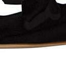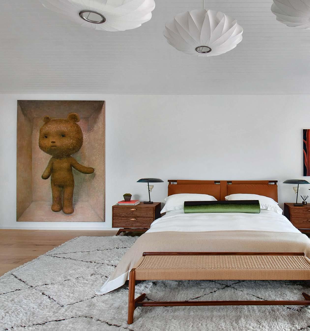 Within the new framework, the designers considered ways to imbue a sophisticated yet cozy vibe without drawing attention away from the art. Coincidentally, just like he had amassed their collection, the husband gravitated toward the value and meaning behind vintage furnishings, which augmented the tone set in each space. “In all of our work, we incorporate some midcentury pieces,” Hoyos notes. “The husband realized he loved this style and could collect pieces like art.” Treating the process in a similar investment manner, he researched the makers and stories behind items such as the dining area’s midcentury modern mahogany table and cane chairs, both complementing the nearby screen, and the living area’s reupholstered Costela chair and ottoman. Maintaining a clean look, the designers focused on a neutral palette and natural materials, including raffia-like rugs throughout and vintage sheepskin chairs in the living area.