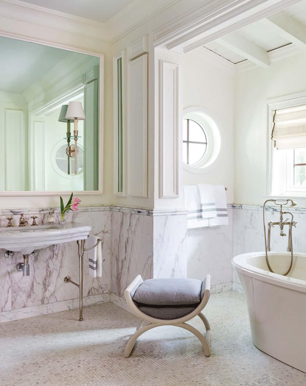 Opposite: Ann Sacks marble appears on the flooring and walls of the wife’s bathroom, outfitted with a BainUltra tub and Theodore Alexander’s Fillmore stool. A Hector Finch wall sconce affixed to the mirror offers ambience.