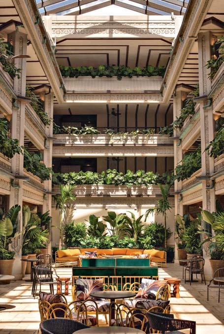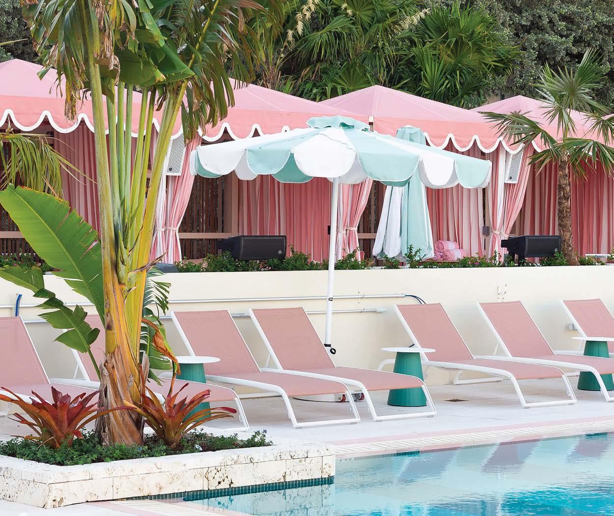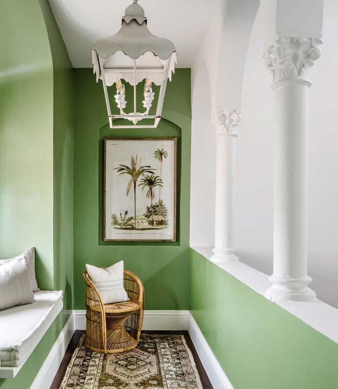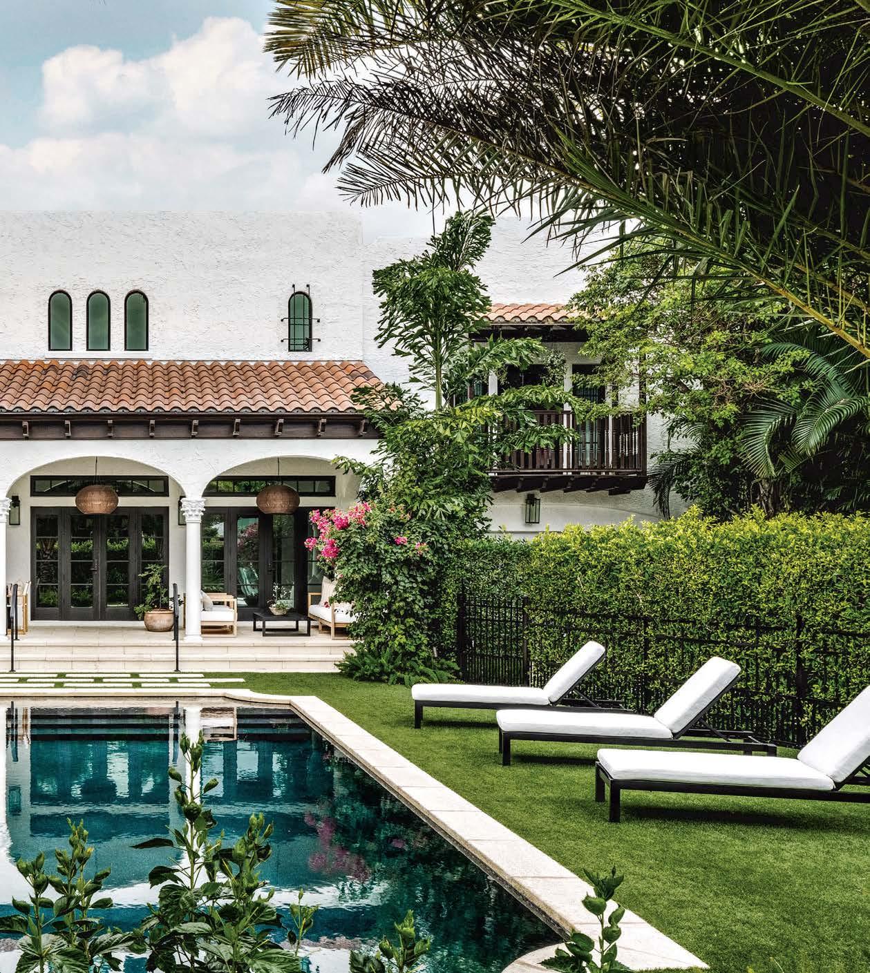 There was another element she couldn’t ignore—incorporating a more restrained version of Palm Beach style into the home. It was important, Miller explains, to still reference the locale’s design influences. To do this, she embraced the classic pink-and-green color scheme with a modern take, including soft blues. The designer considered each room with a singularity, as the 1920s architecture meant separate rooms rather than a contemporary openconcept layout. But, using the chosen color palette as the baseline—sometimes quiet, sometimes dramatic—she also ensured there was a natural