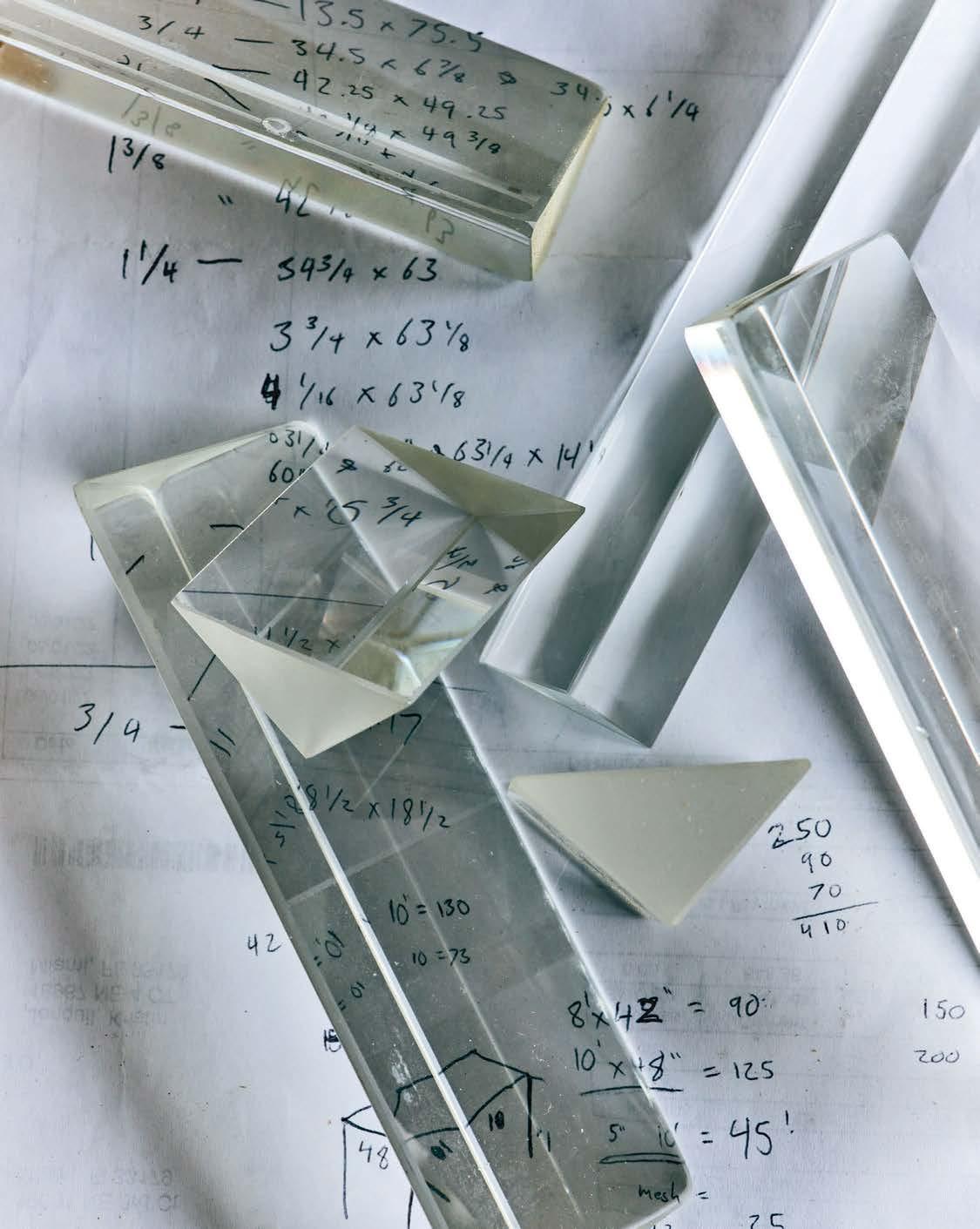 Manipulating clear and mirrored glass achieves this incorporeal experience. Jonquil carefully calculates his structures’ dimensions through sketches and CAD programs to create these prism-like effects. In his Miami warehouse studio stacked with glass sheets, he often cuts and bonds pieces by hand onto metal scaffolding. Together, these facets create cascading shapes that shift when observed from different angles. “Its form emerges from emptiness, emptiness emerging from form,” says the artist, who is represented by Emerson Dorsch. Sometimes paired with fluorescent bulbs, these reflections multiply into labyrinths of light.