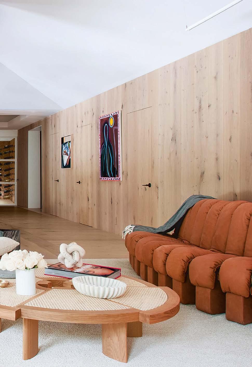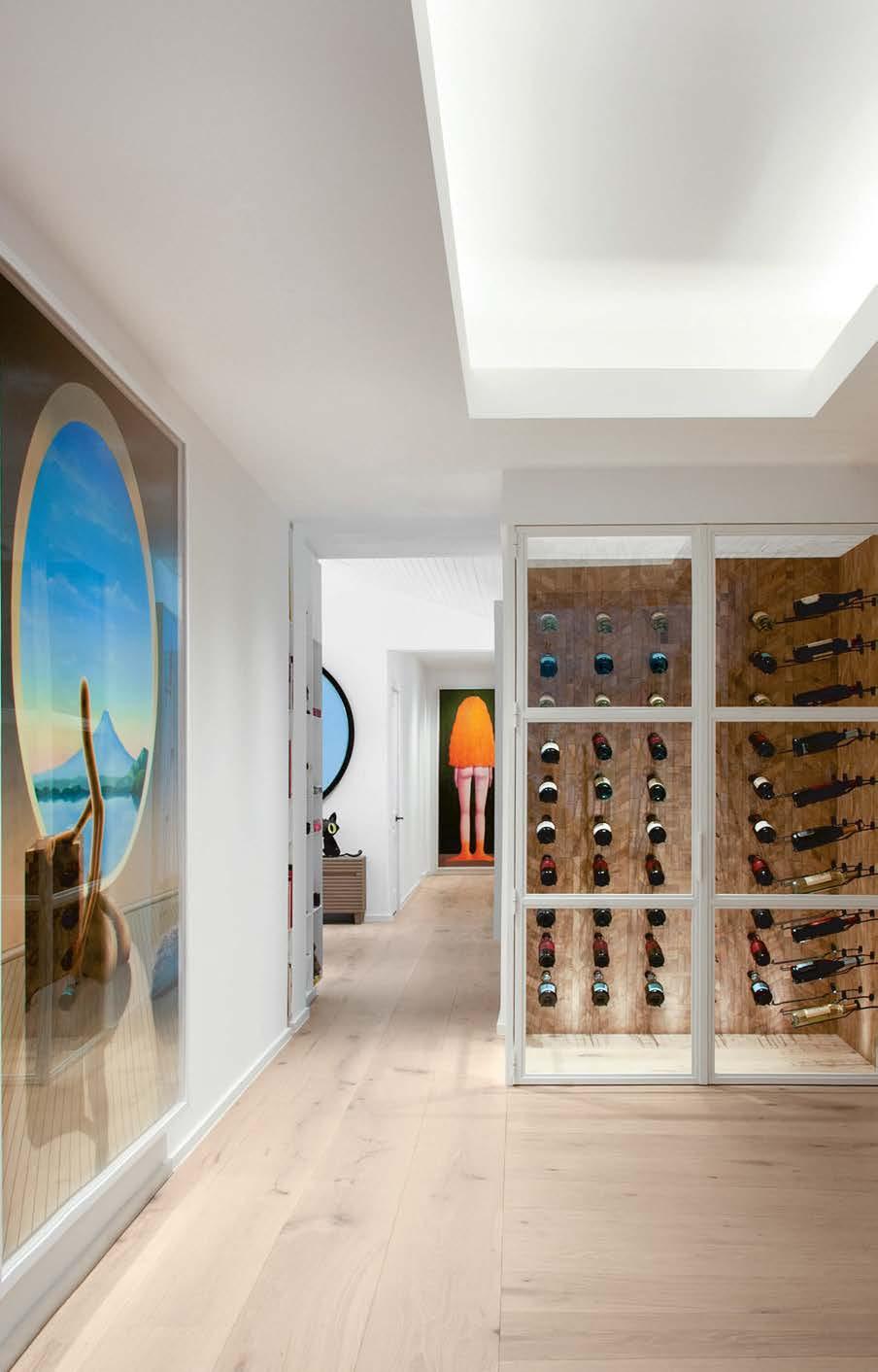 Right: French oak flooring from Pianeta Legno Floors lines a hallway adorned with an Emily Mae Smith piece leading to a Nicolas Party work. Dea Italiana fabricated the wine cellar with a wood floor and walls by Oscar Ono.