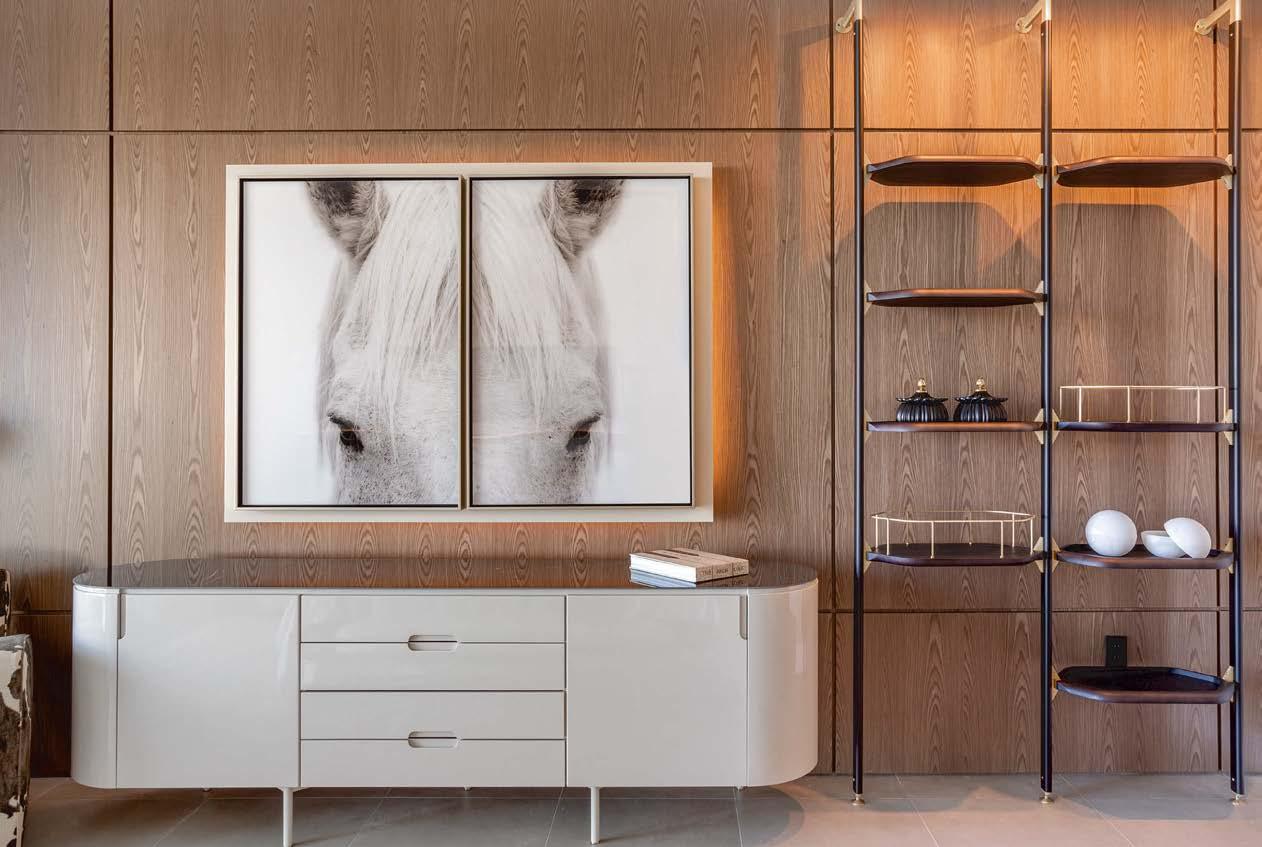 Most walls were painted white to create a neutral backdrop for the art, yet the owners embraced an element the designers encouraged to warm up the home’s museum-like quality: lightly stained oak woodwork—the more, the better. “We suggest wood all the time to clients, but they’re usually scared to have too much of it,” Weber laughs. “We think there is never too much.” In addition to installing millwork throughout the residence, “we used engineered wood flooring in the living and dining areas and the same paneling on the walls,” Arenas adds. Flush frameless doors in the space remain concealed, creating a seamless look.