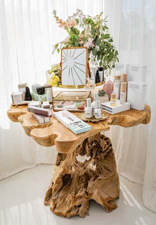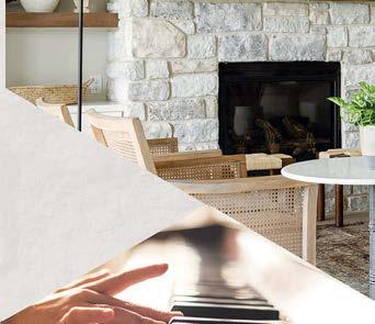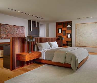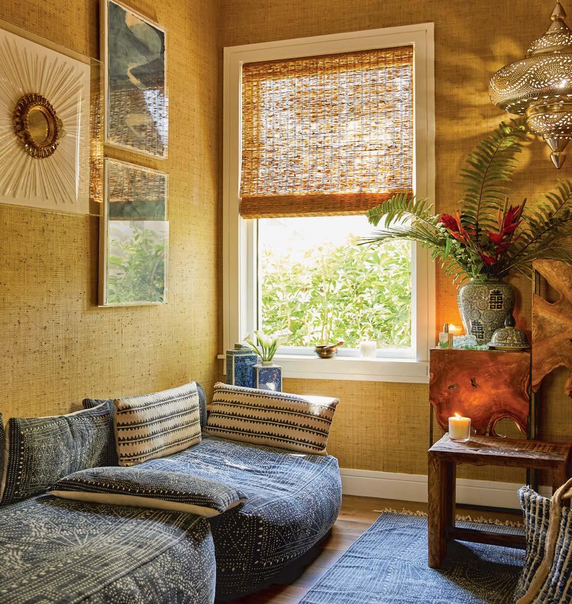 midday respite, the designer wrapped the space in a Kravet raffia, adding comfortable pillows in a HomArt batik fabric and live-edge wood stands to display healing objects. “We believe meditation is an important element of the day to gather a sense of self when the bustle feels all-consuming,” she says. “It helps us stay connected to our larger purpose for being here.” lisakahndesigns.com