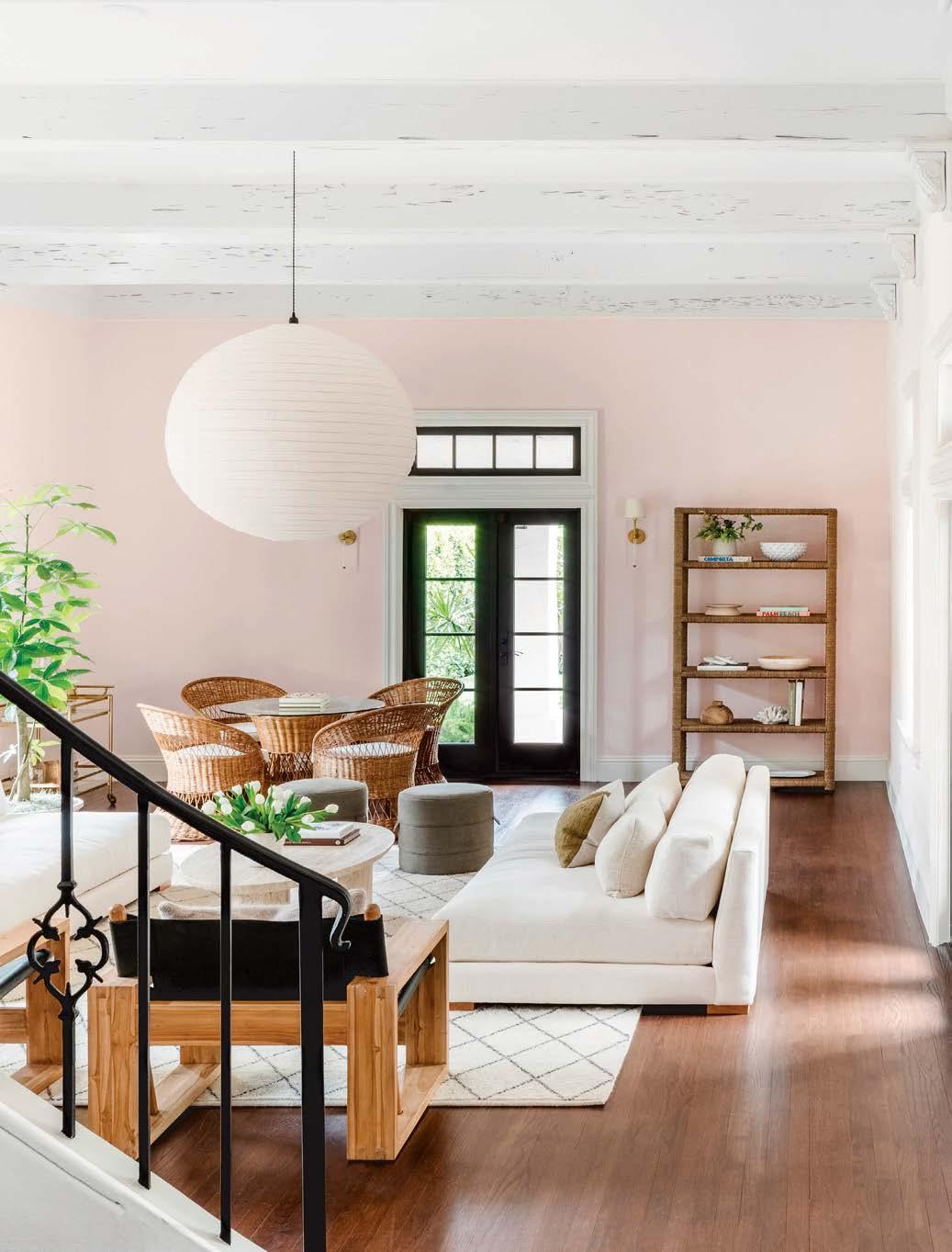 After dinner, a transition to the living room for cocktails or coffee provides a subtler tribute to the region with its blush walls, chairs with moss-green leather seats and vintage wicker game table and chairs. “The wall color was already in the space,” the designer reveals. “But once we took out all the furnishings, including pink sofas, I realized it could work if we did it in our own way.” This included low-profile, armless, white linen sofas; a travertine coffee table; and an oversize globe pendant. “Now the color is soft,” she muses, adding that the understated palette allows the white plaster fireplace to play center stage—“whereas before, the pink felt strong and prominent.”