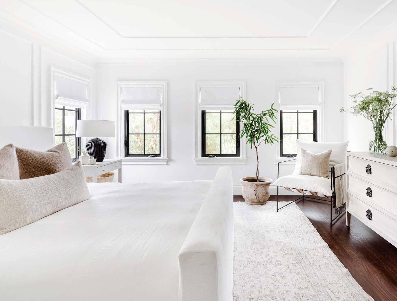 Above: A custom linen slipcovered bed sets a serene tone in the primary bedroom. Miller layered shades of white with a vintage floor covering from Heir Looms Vintage Rugs, Croft House’s Sierra chair and a CFC dresser. The Made Goods nightstand is topped with an Arteriors lamp.
