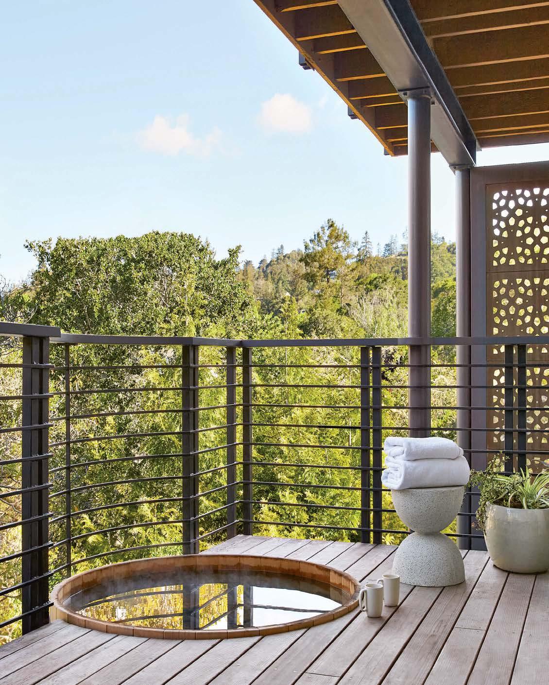 When hired by clients with an appreciation for the Japanese bathing ritual of a shower to cleanse the body followed by a bath to cleanse the soul, designer Lindsay Anyon Brier saw a unique opportunity for an exterior wellness space. Specifically, when she viewed their Piedmont, California, home’s deck, set conveniently off a gym, she envisioned a soaking tub. In collaboration with Berkeley Heat, she conceived a cedar hot tub seemingly dropped within the tree line. Underscoring the home’s commitment to sustainability, the creation boasts a drainage feature in lieu of chemical maintenance. (Wastewater is then used to irrigate the property.) Adding a touch of sparkle to the scene, decorative screens with a Moroccan motif “create a sense of privacy and intimacy while focusing the eye on views of San Francisco Bay,” notes the designer. anyondesign.com