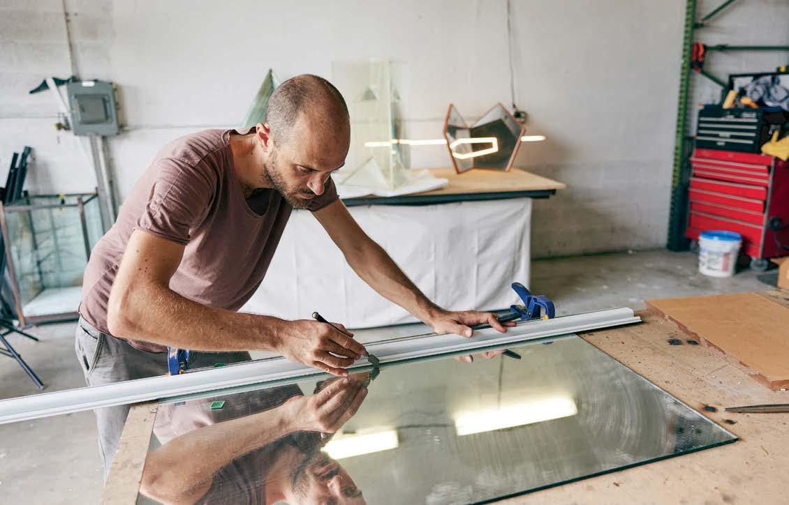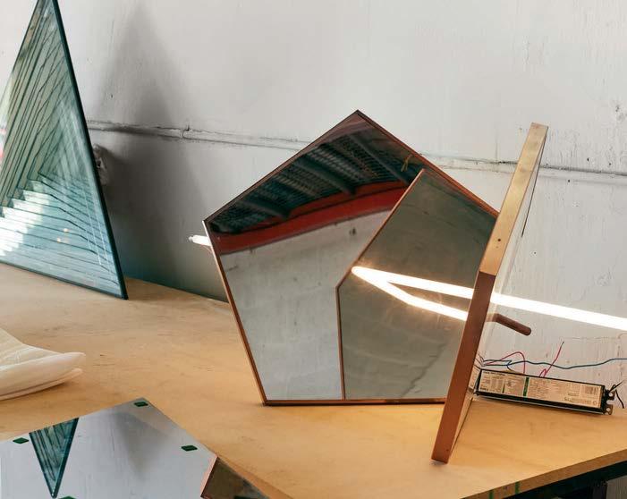 In his warehouse-like Miami studio, artist Brookhart Jonquil (bottom) measures a piece of mirrored glass for a sculpture. Occasionally incorporating fluorescent bulbs (below), he uses intangible forces to create art—often rendered in angular (left) or geometric forms (opposite)—that warp the way viewers witness space and light for a visual illusion.