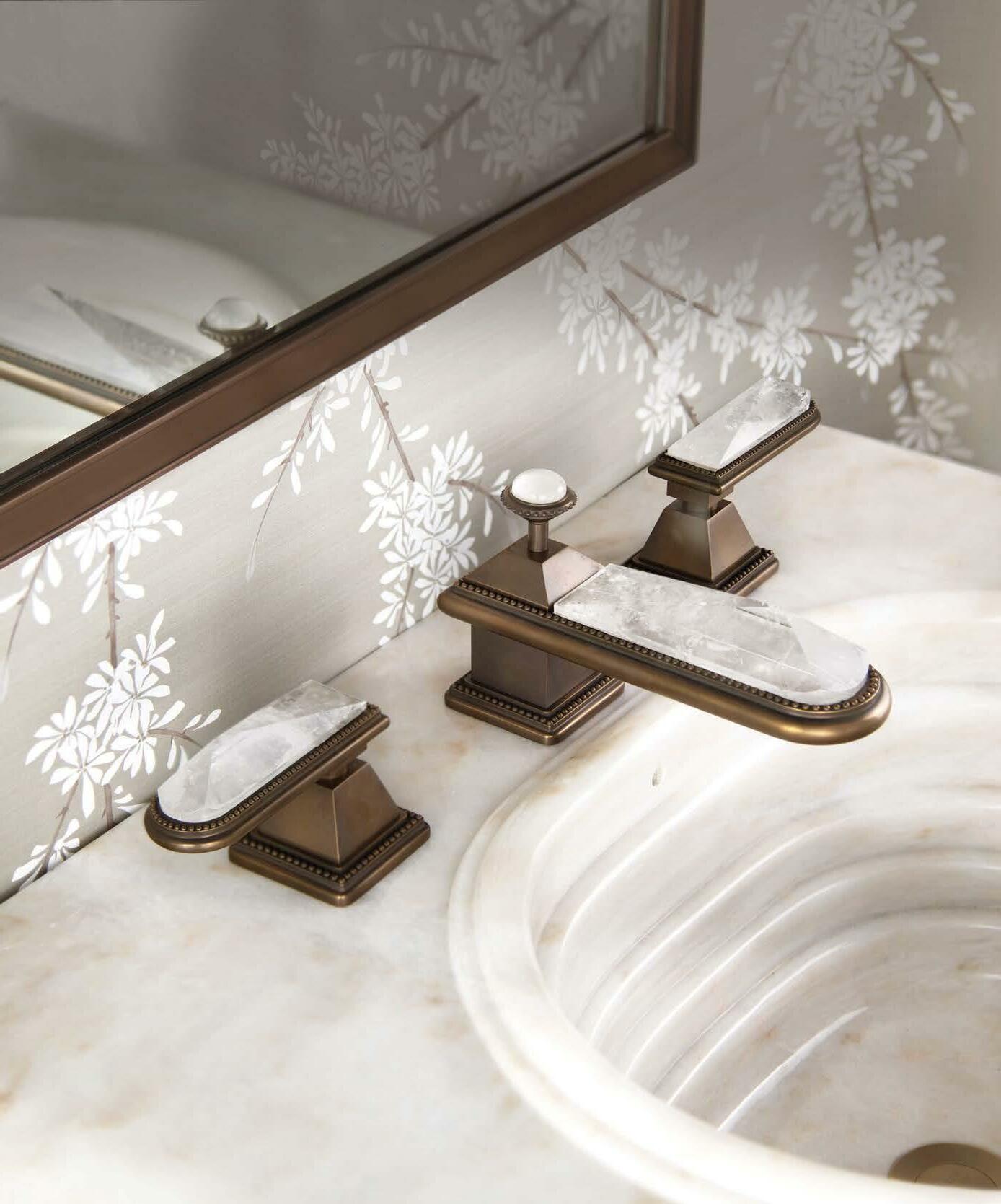 Shown here in Oil Rubbed Brass with Rock Crystal, this original design is unmatched in style and quality. Produced according to the highest standards at Sherle Wagner International’s dedicated Massachusetts factory. Browse the Pyramid Collection at sherlewagner.com WallcoveringbyFromental.
