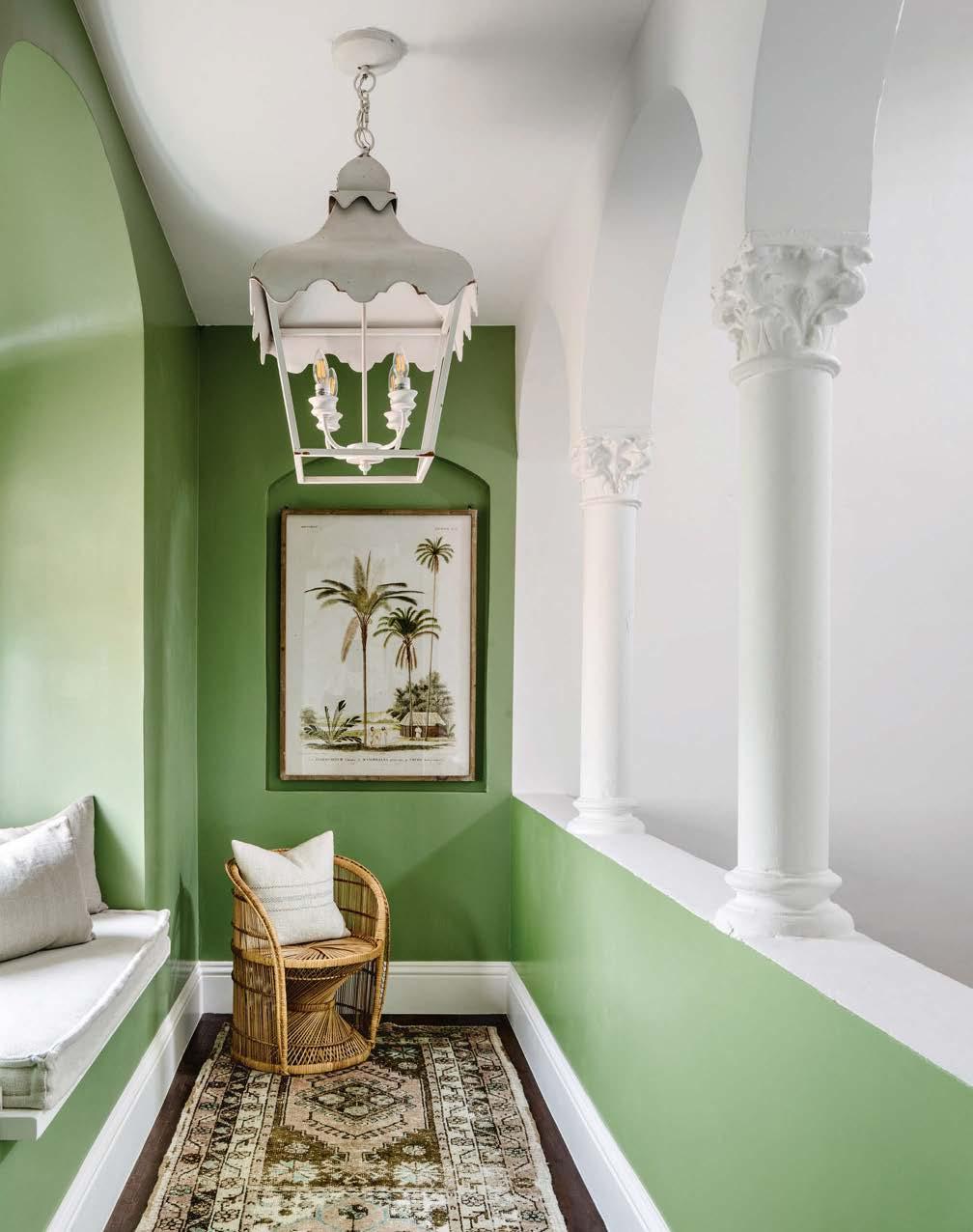 Leave it to designer Martyn Lawrence Bullard to kick any notions that neutral and wellness must walk hand-in-hand to the curb. Exhibit A: This exuberant massage room set high on a cliff in Cabo San Lucas, Mexico. Bullard confidently swathed the space in Benjamin Moore’s Covington Blue, a languid, ocean-green tone that plays to the Sea of Cortez beyond the windows. A medley of natural woven sisal and abaca furnishings—all nods to indigenous Mexican arts and crafts—join a 1970s painting scored at an antique shop in Mexico City, which Bullard admits is his favorite element of the room. “The vibrancy holds you captive whilst still maintaining calmness due to its abstract nature and ear thy pigments,” he explains, adding, “it has a distinct and welcoming warmth reminiscent of Cabo’s famous sunsets.”